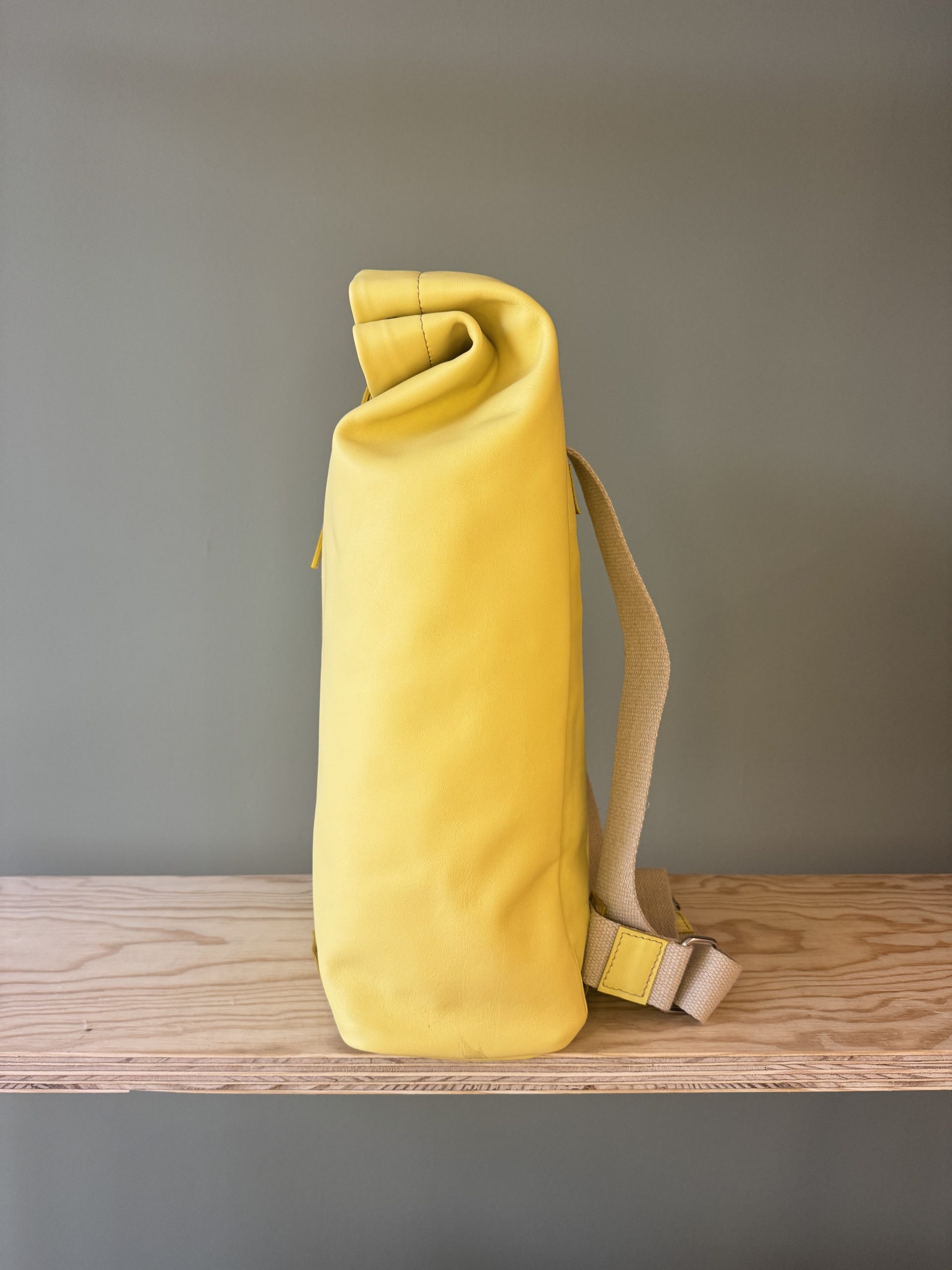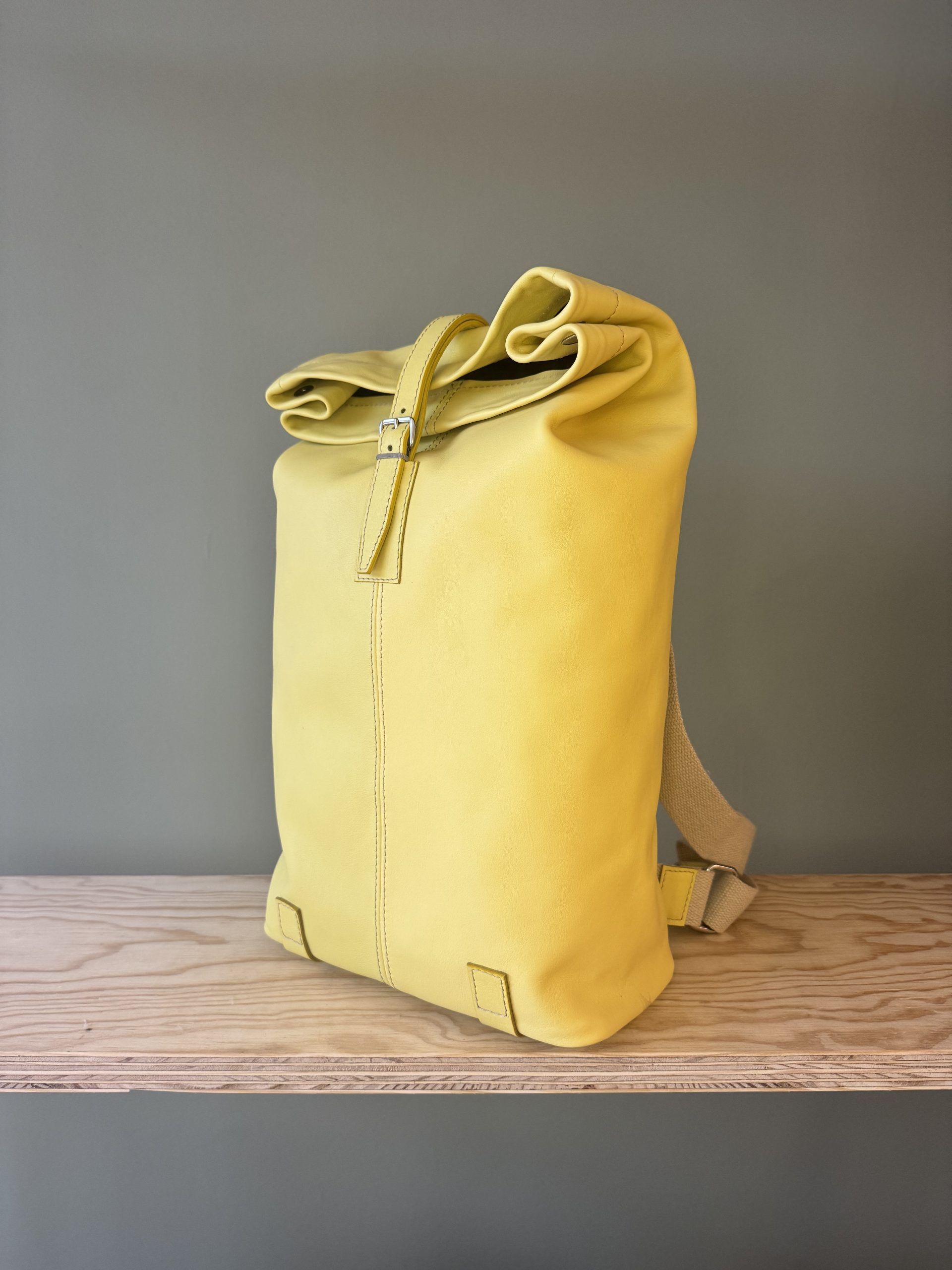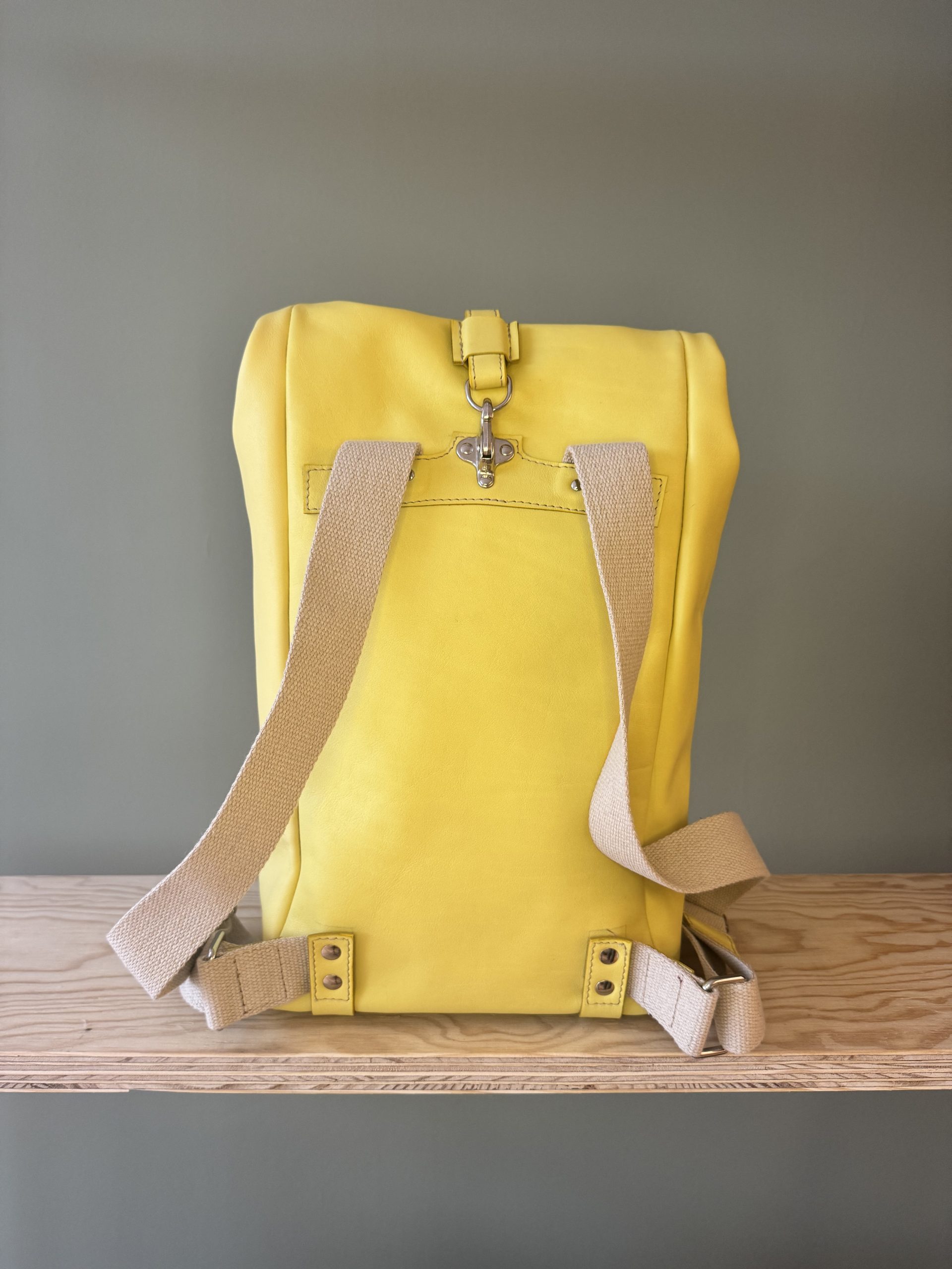 Der Rucksack aus hochwertigem Rindsleder besticht wegen seines schlichten Formats. Die Riementräger aus Leinen sind der gewollte Kontrast zum pflanzlich gegerbten Lederrucksack. Der Träger, als einziges von der Front sichtbares Element, lässt auf den ersten Blick nicht erahnen, was folgt.