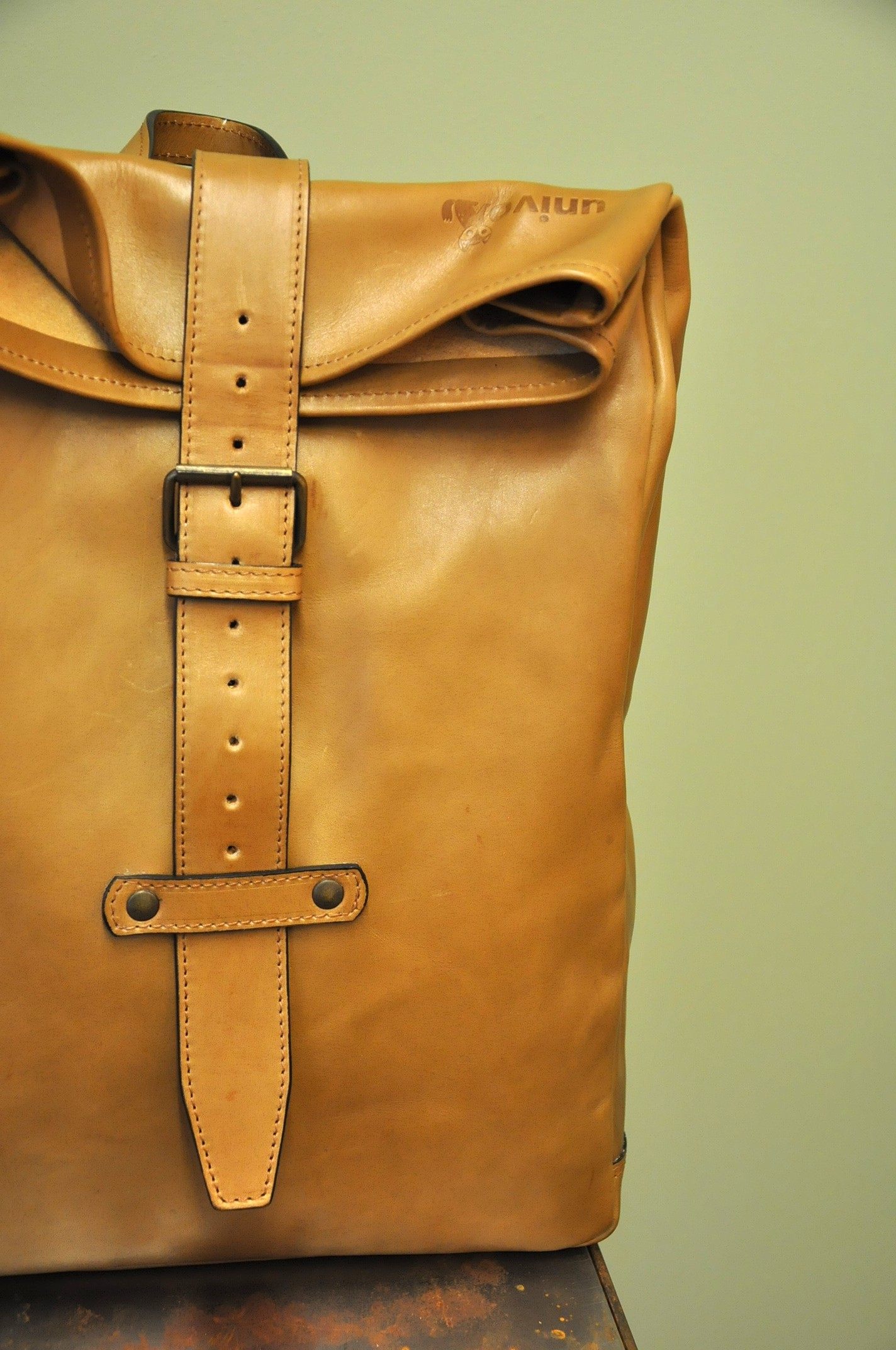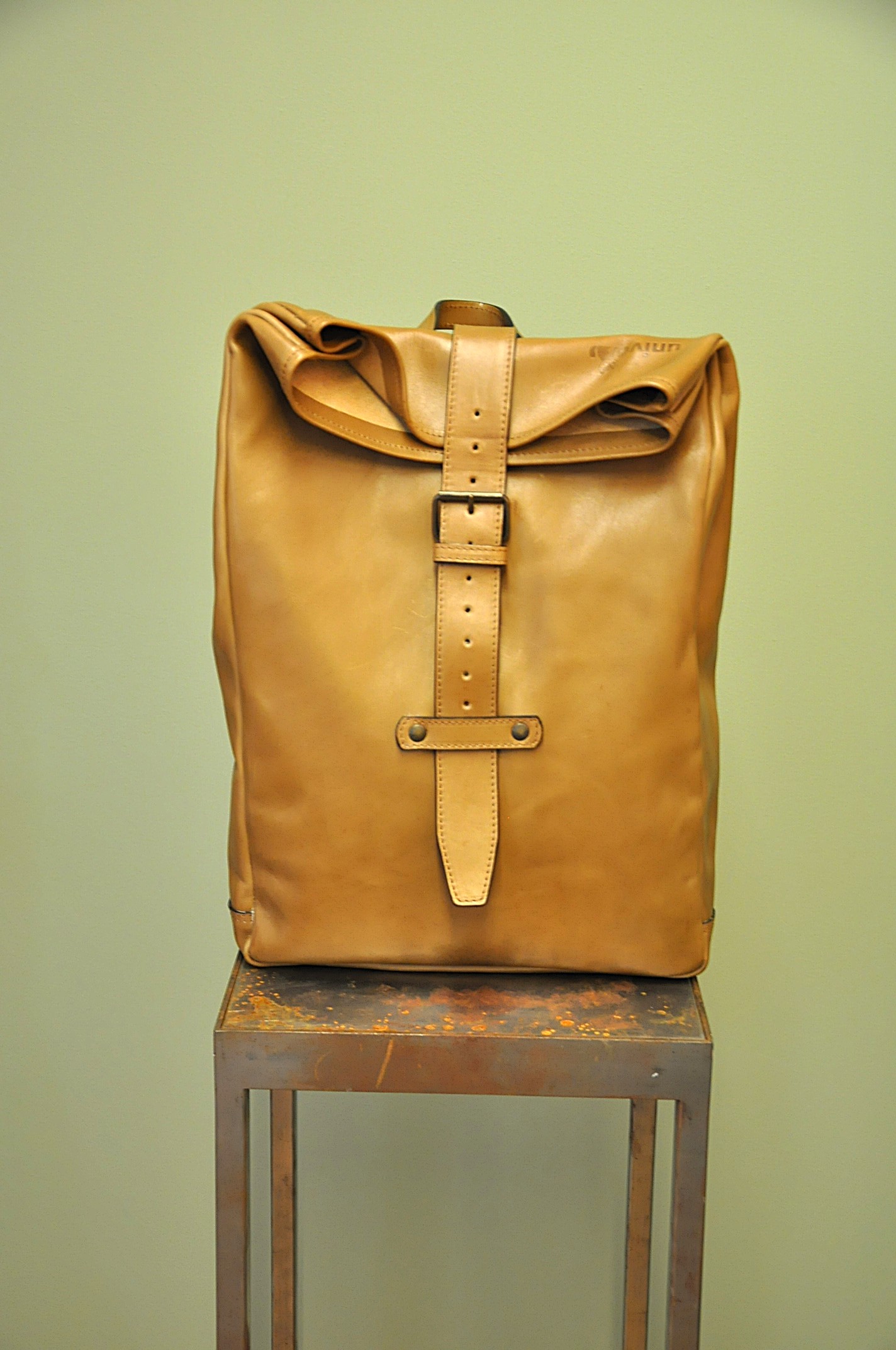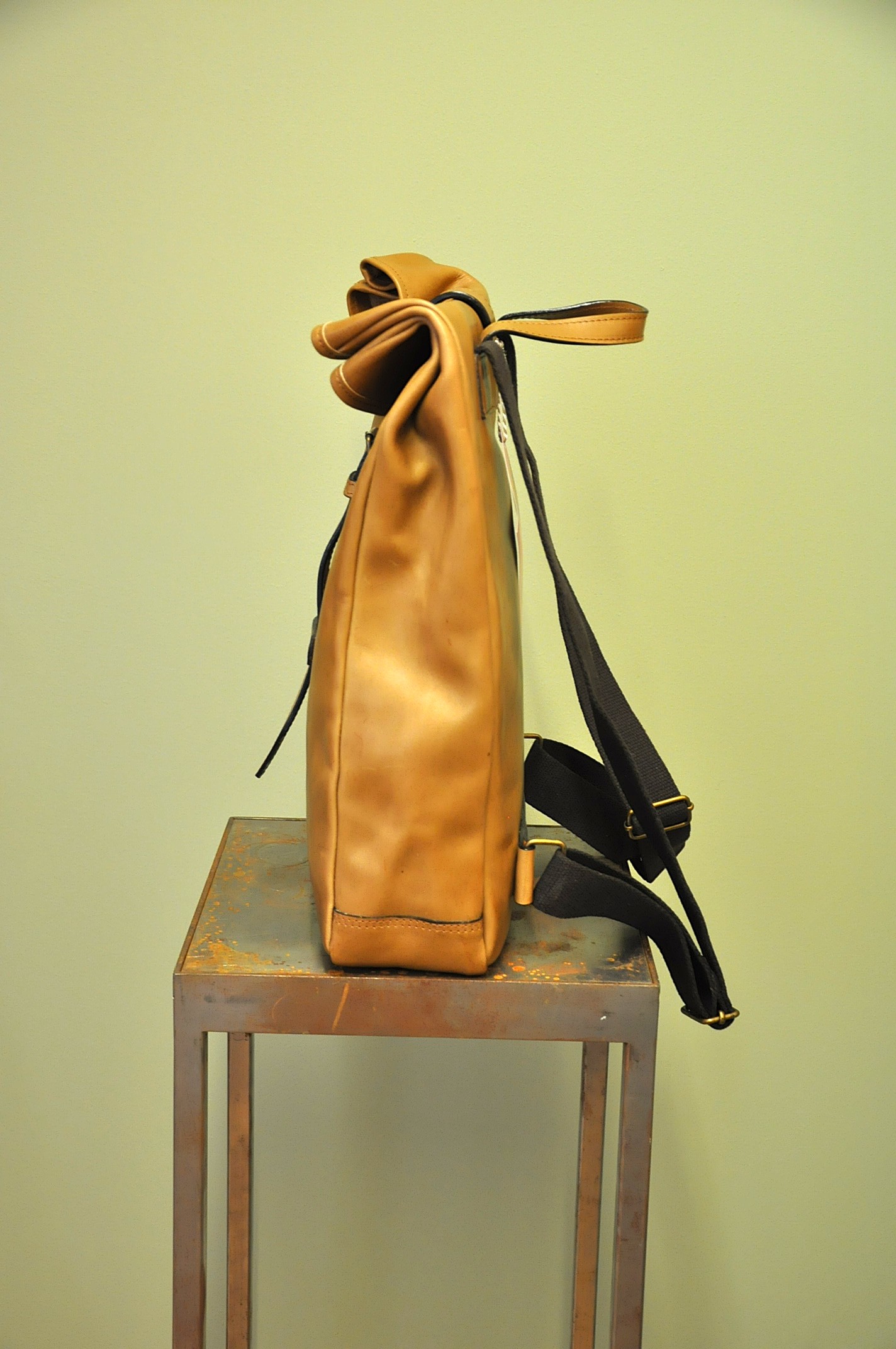 Der Rucksack aus hochwertigem Rindsleder besticht wegen seines schlichten Formats. Die Riementräger aus Leinen sind der gewollte Kontrast zum pflanzlich gegerbten Lederrucksack. Der Träger, als einziges von der Front sichtbares Element, lässt auf den ersten Blick nicht erahnen, was folgt.