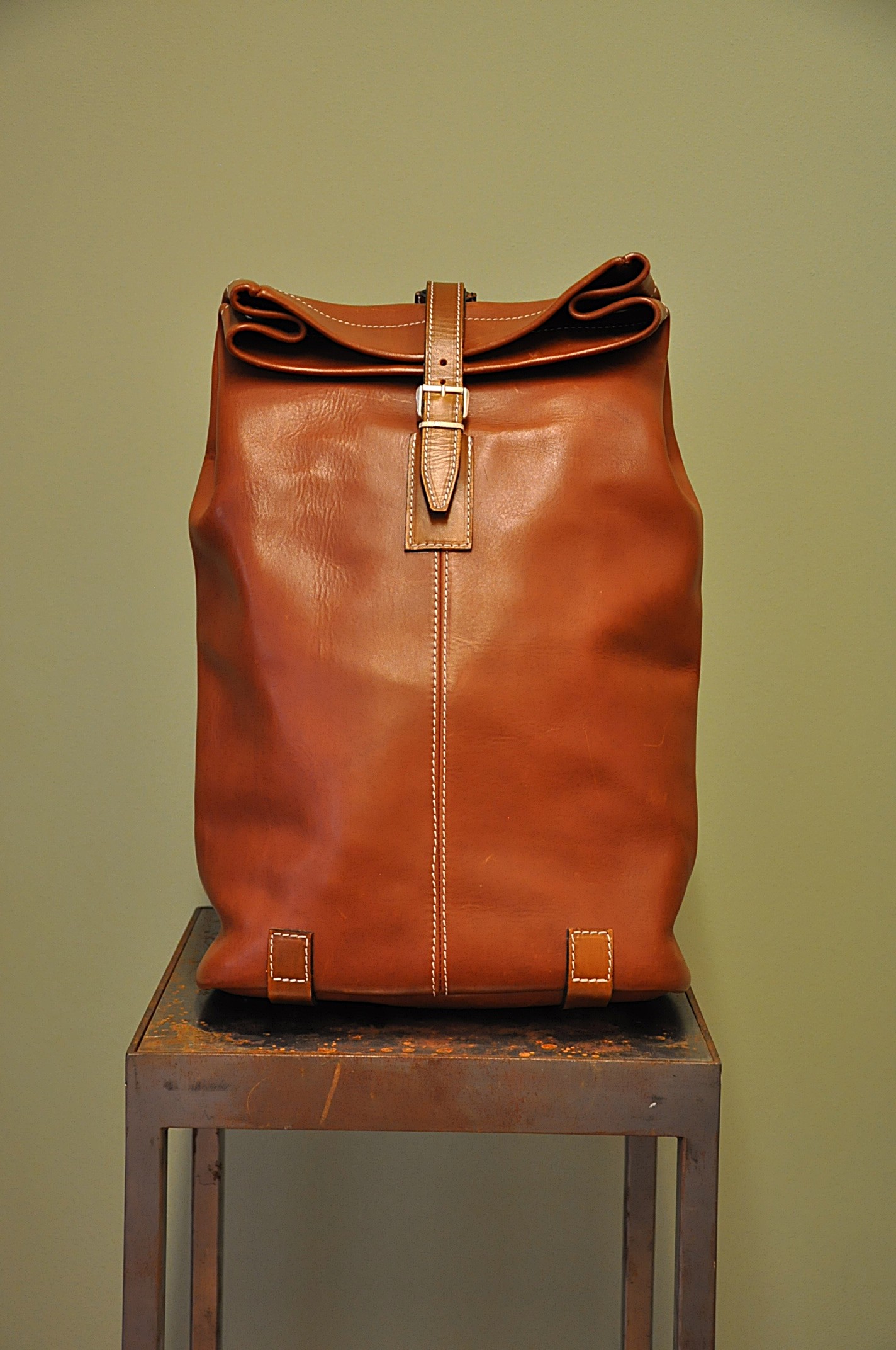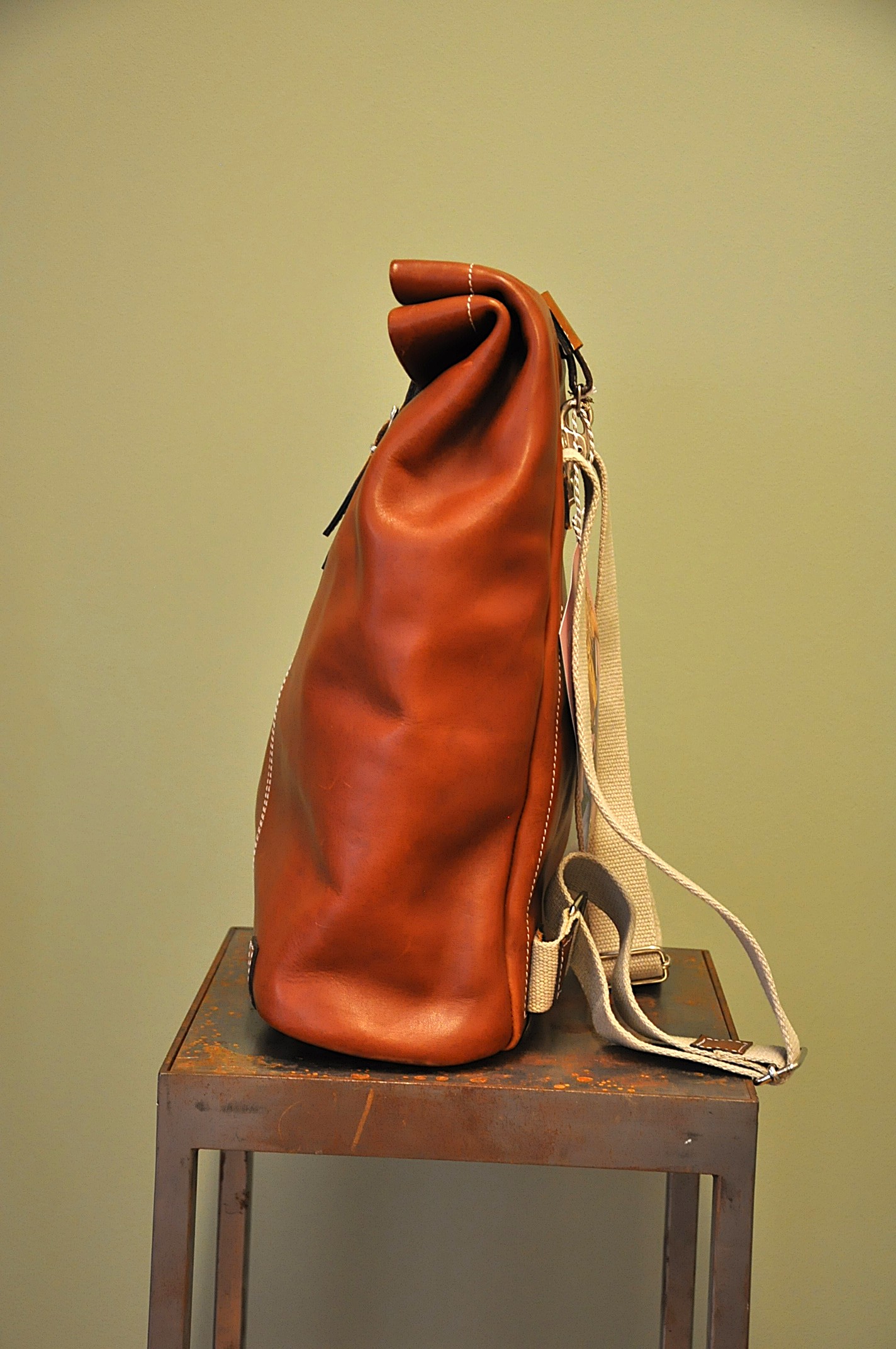 Der Rucksack aus hochwertigem Rindsleder besticht wegen seines schlichten Formats. Die Riementräger aus Leinen sind der gewollte Kontrast zum pflanzlich gegerbten Lederrucksack. Der Träger, als einziges von der Front sichtbares Element, lässt auf den ersten Blick nicht erahnen, was folgt.