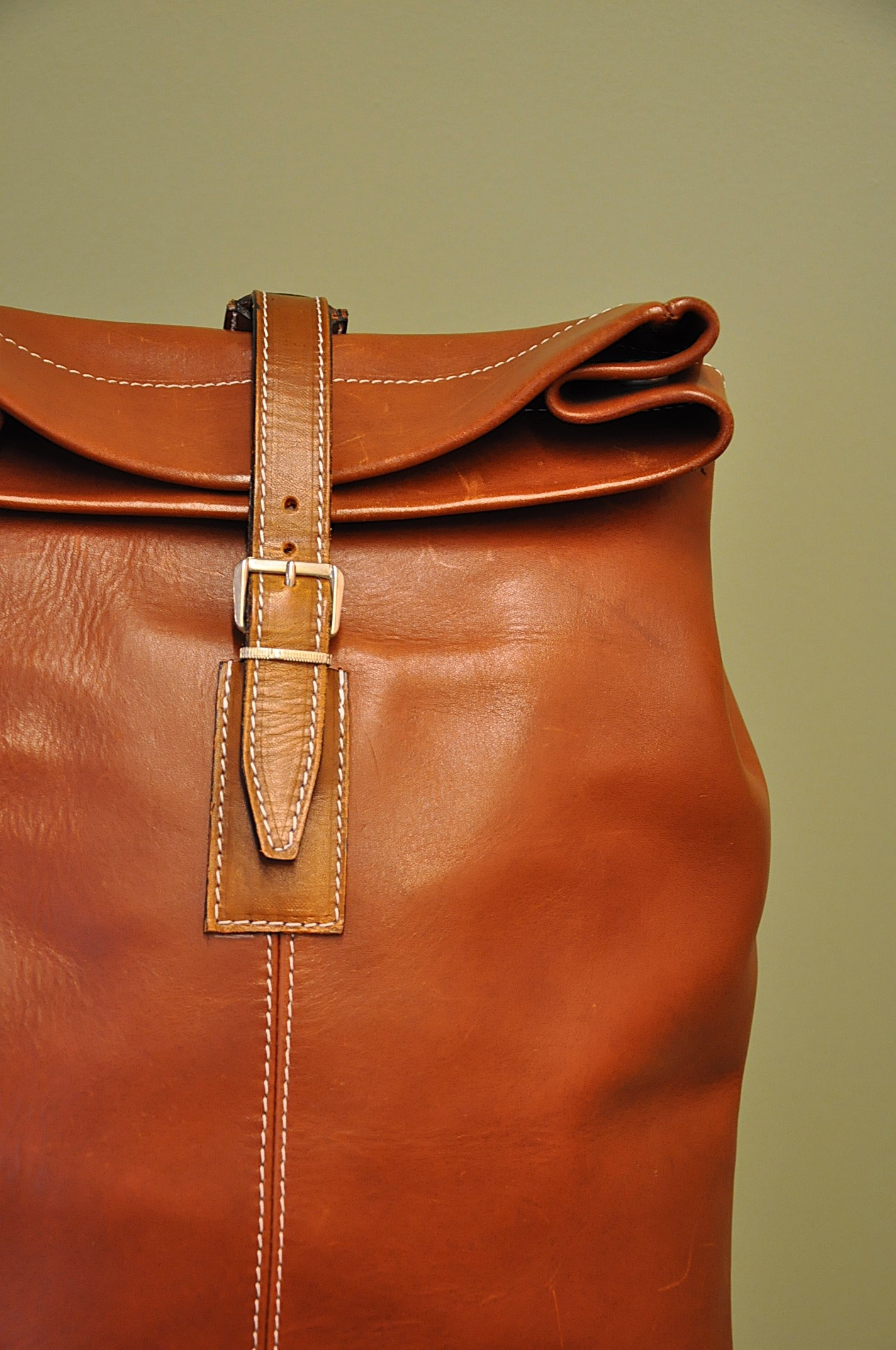 Die Kombination des Leders und der Stoffriemen, die darauf farblich abgestimmten Nähte, und die Verschlüsse sowie Nieten aus Metall machen den Rucksack einzigartig. Einfach, edel, robust, langlebig und treu soll er sein. «Der Wert des Werks!»