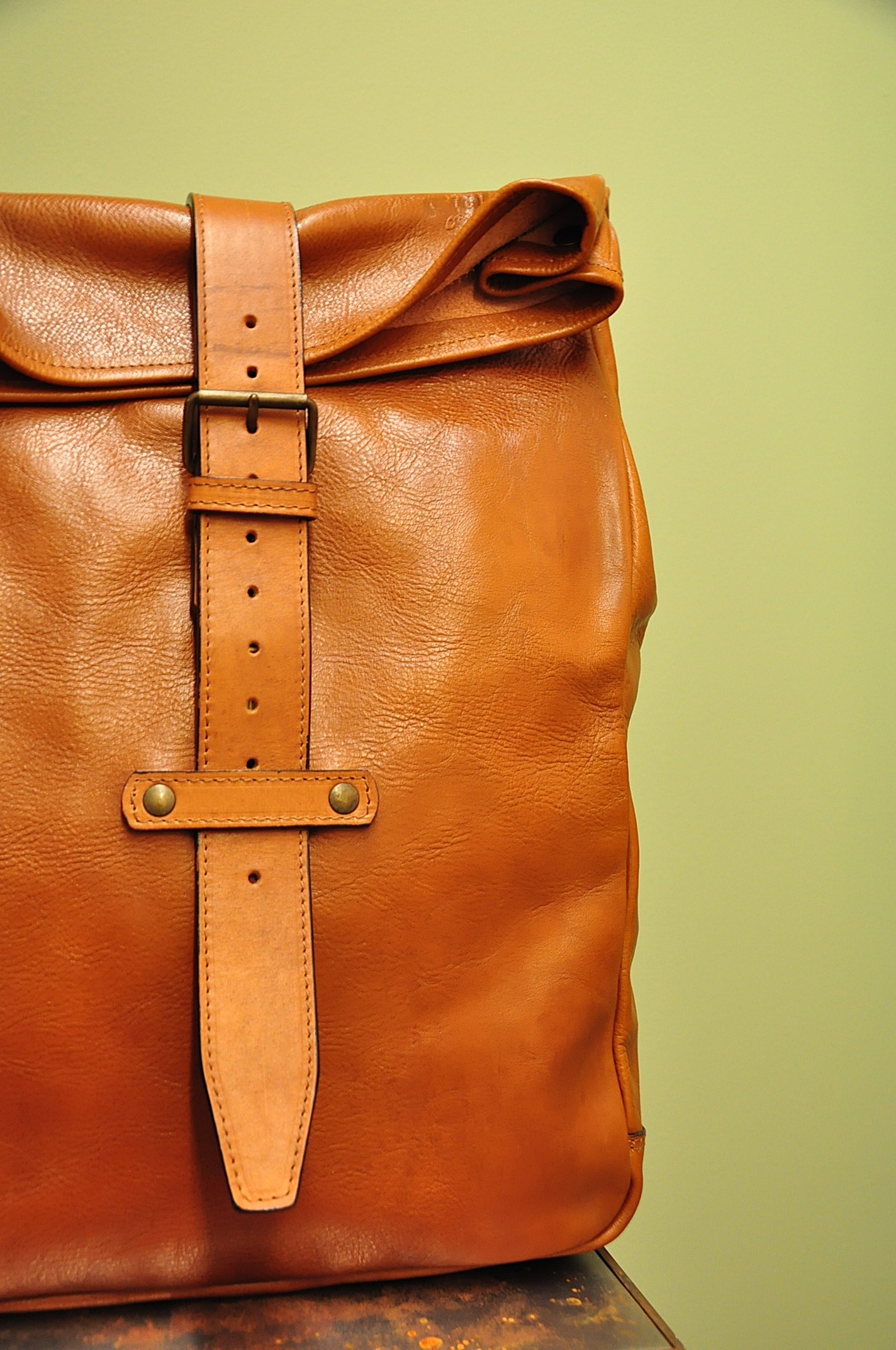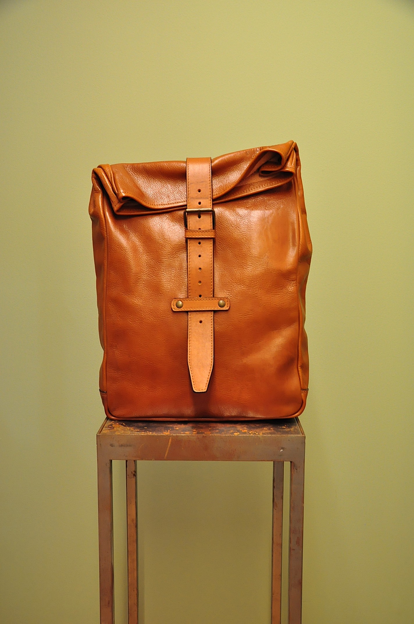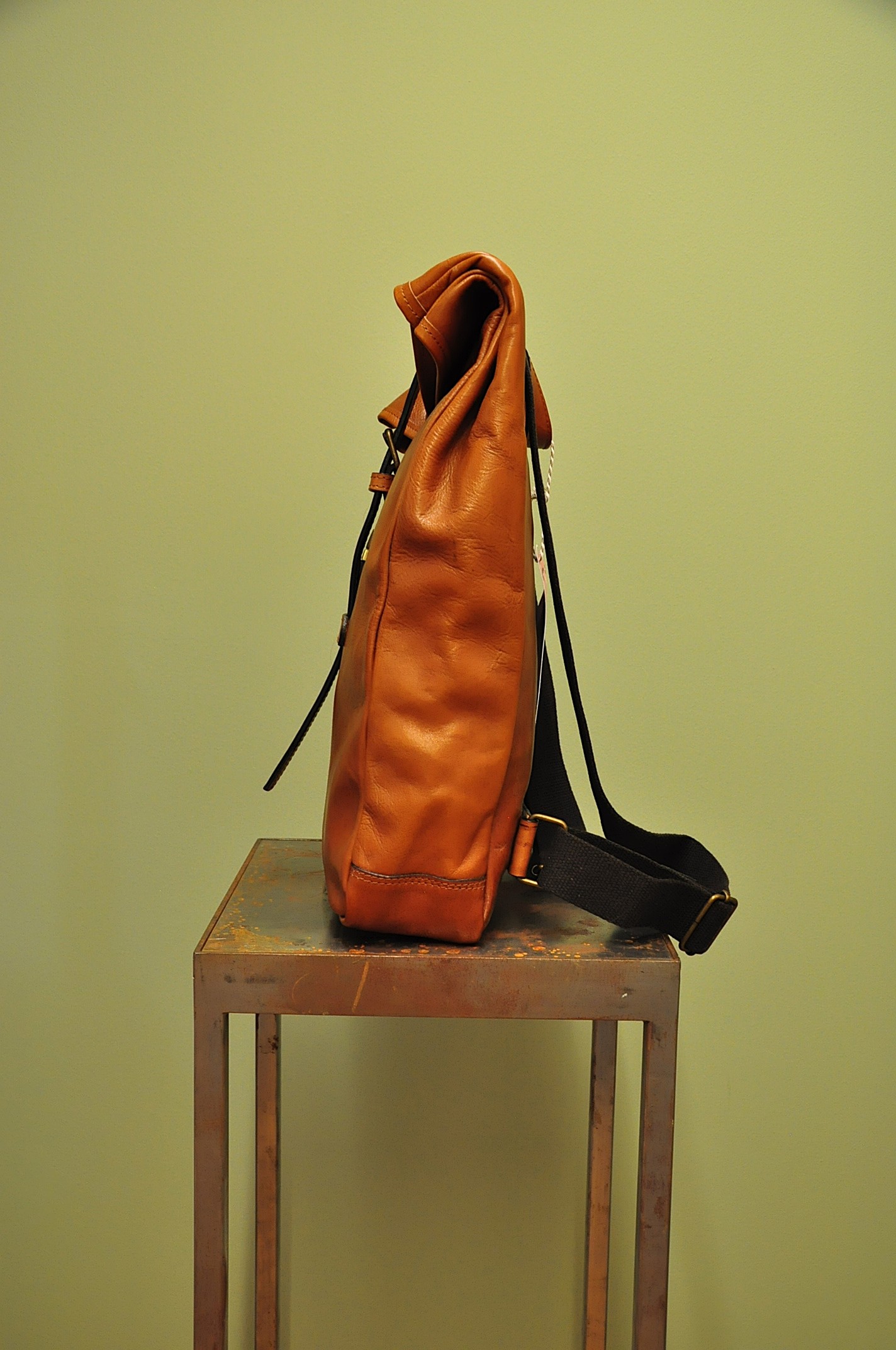 Der Rucksack aus hochwertigem Rindsleder besticht wegen seines schlichten Formats. Die Riementräger aus Leinen sind der gewollte Kontrast zum pflanzlich gegerbten Lederrucksack. Der Träger, als einziges von der Front sichtbares Element, lässt auf den ersten Blick nicht erahnen, was folgt.