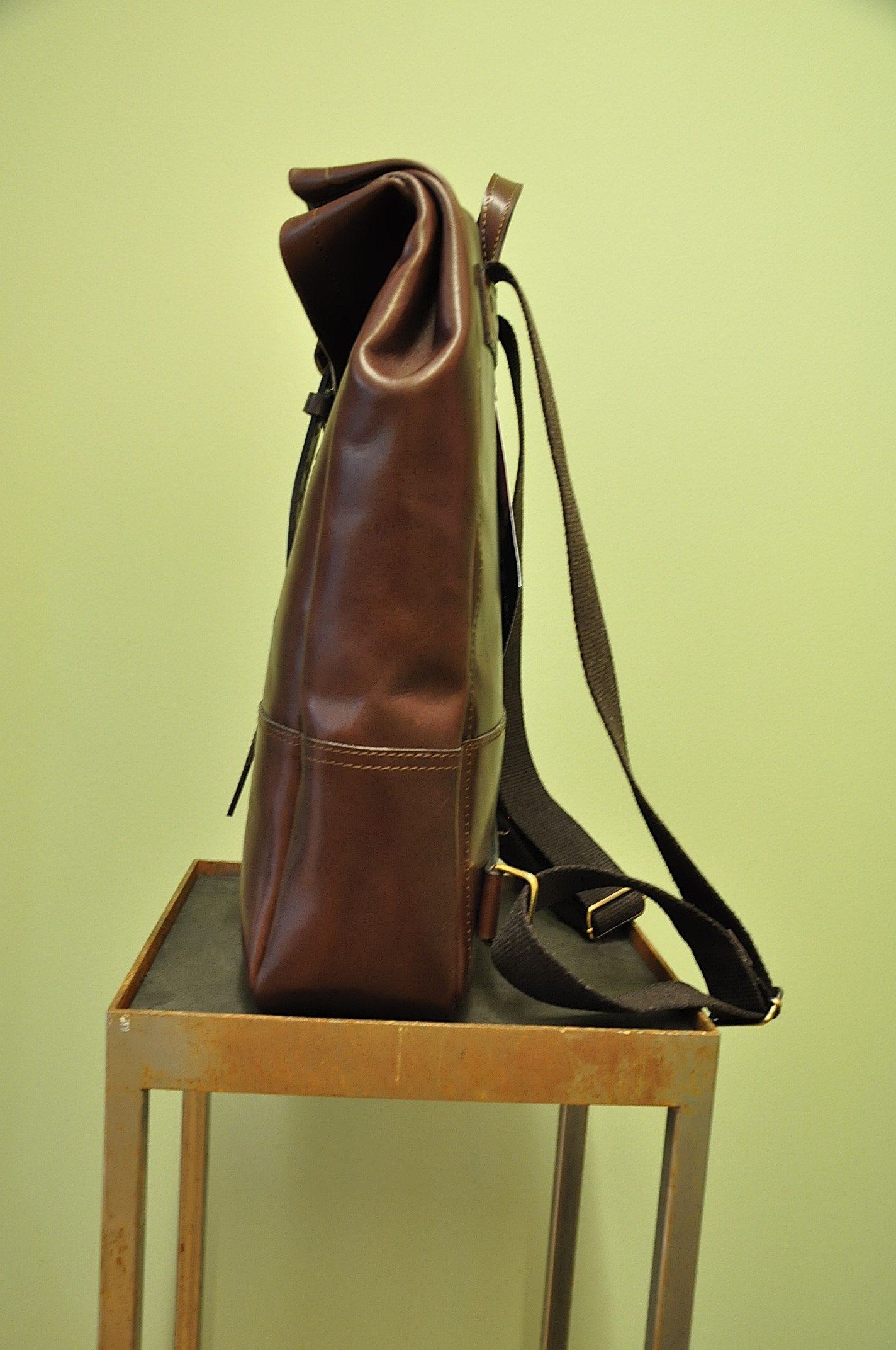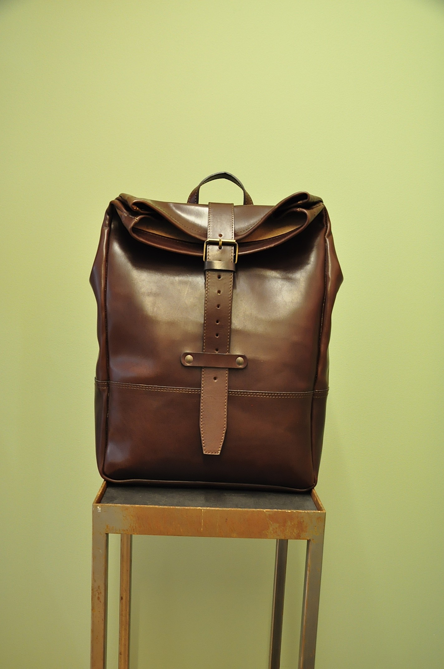 Der Rucksack aus hochwertigem Rindsleder besticht wegen seines schlichten Formats. Die Riementräger aus Leinen sind der gewollte Kontrast zum pflanzlich gegerbten Lederrucksack. Der Träger, als einziges von der Front sichtbares Element, lässt auf den ersten Blick nicht erahnen, was folgt.