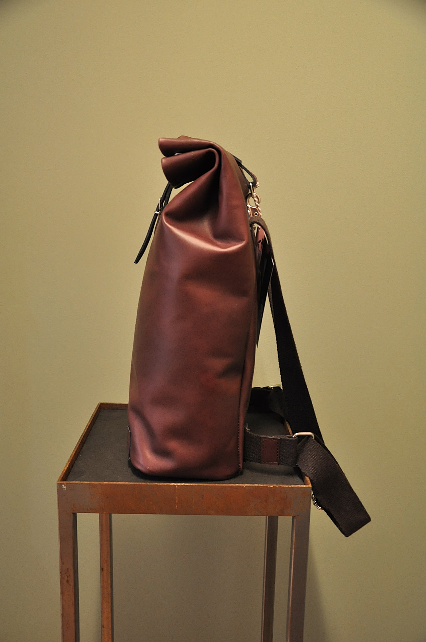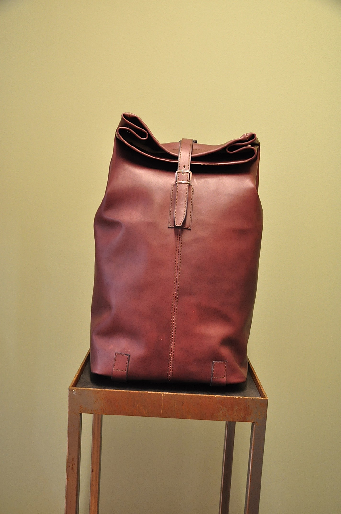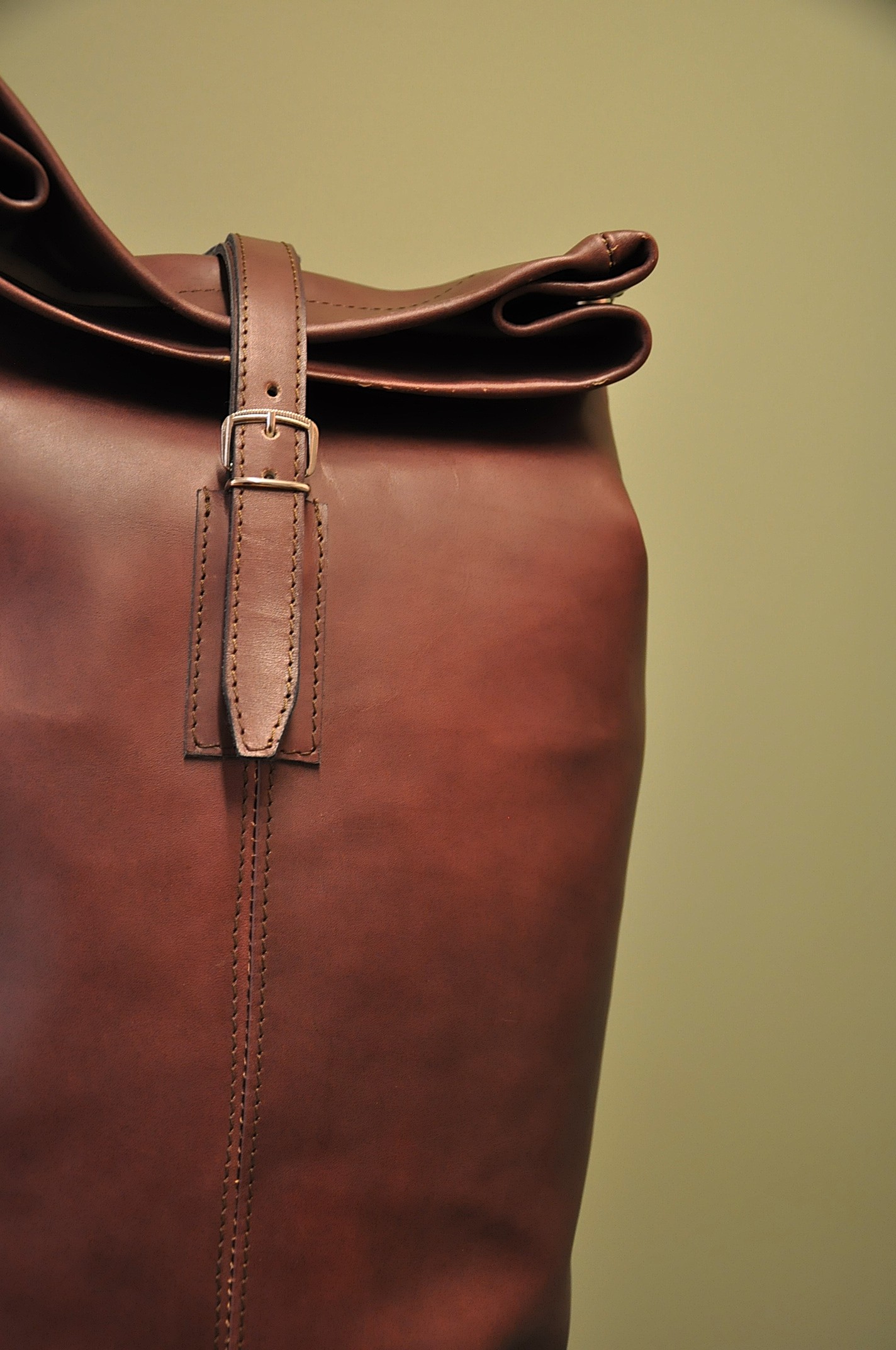 Der Rucksack aus hochwertigem Rindsleder besticht wegen seines schlichten Formats. Die Riementräger aus Leinen sind der gewollte Kontrast zum pflanzlich gegerbten Lederrucksack. Der Träger, als einziges von der Front sichtbares Element, lässt auf den ersten Blick nicht erahnen, was folgt.