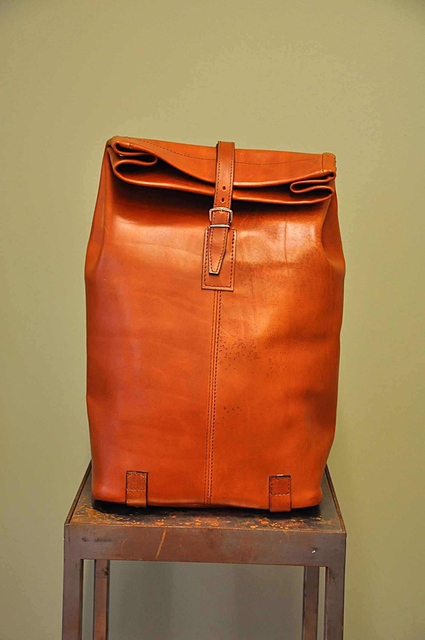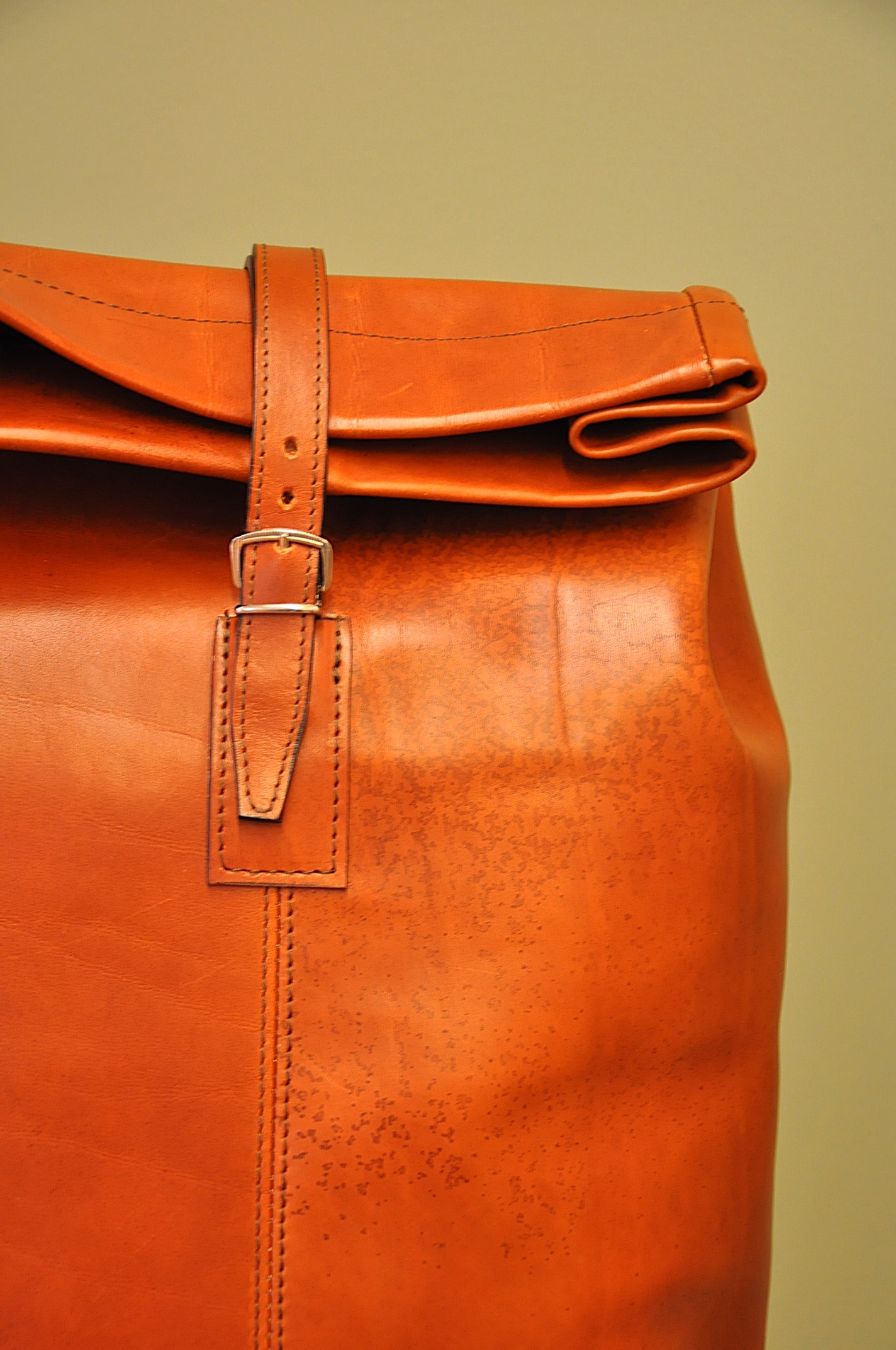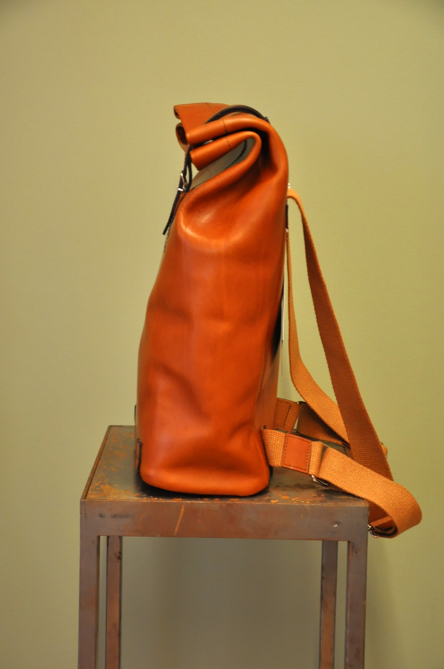 Der Rucksack aus hochwertigem Rindsleder besticht wegen seines schlichten Formats. Die Riementräger aus Leinen sind der gewollte Kontrast zum pflanzlich gegerbten Lederrucksack. Der Träger, als einziges von der Front sichtbares Element, lässt auf den ersten Blick nicht erahnen, was folgt.