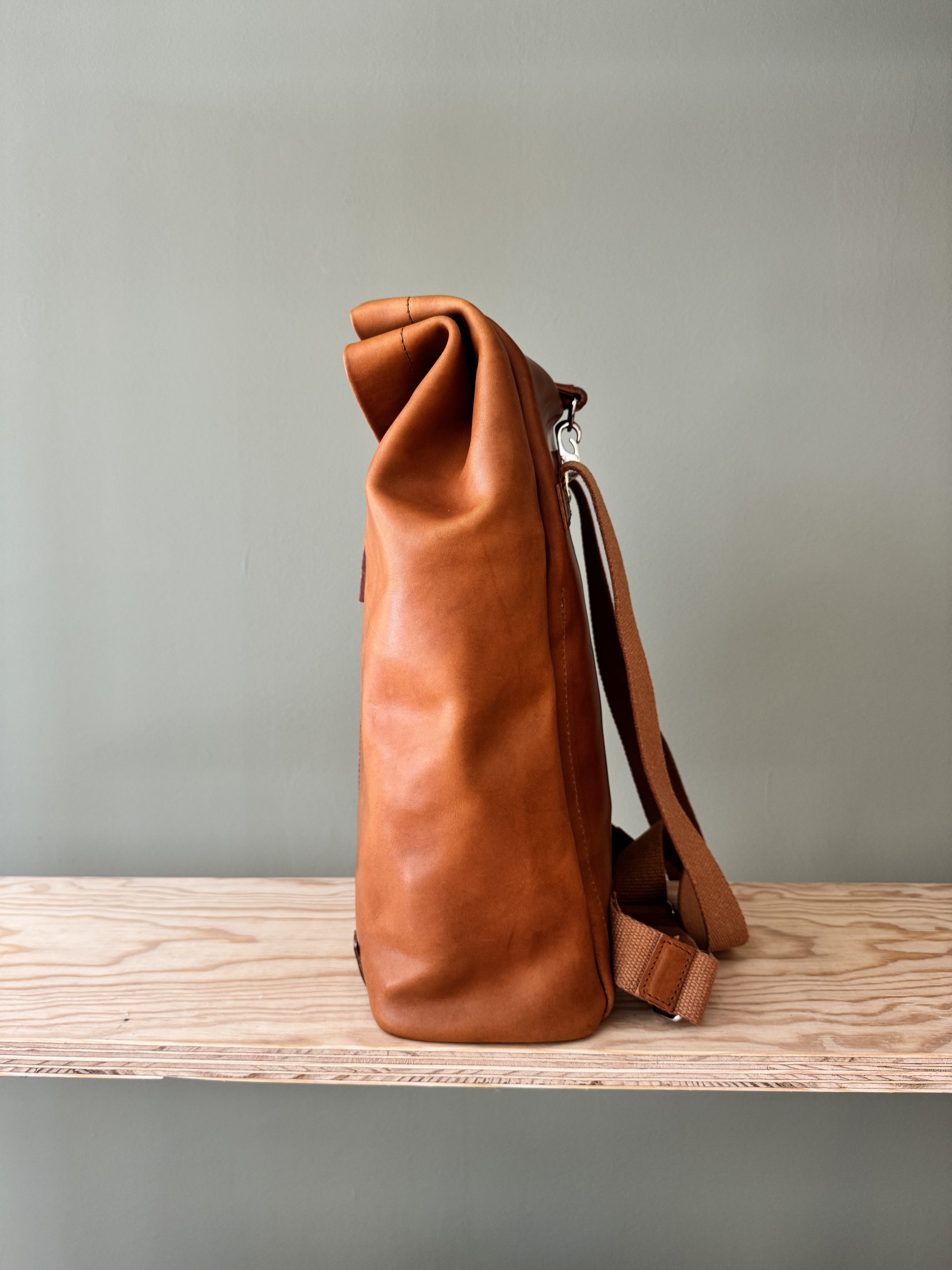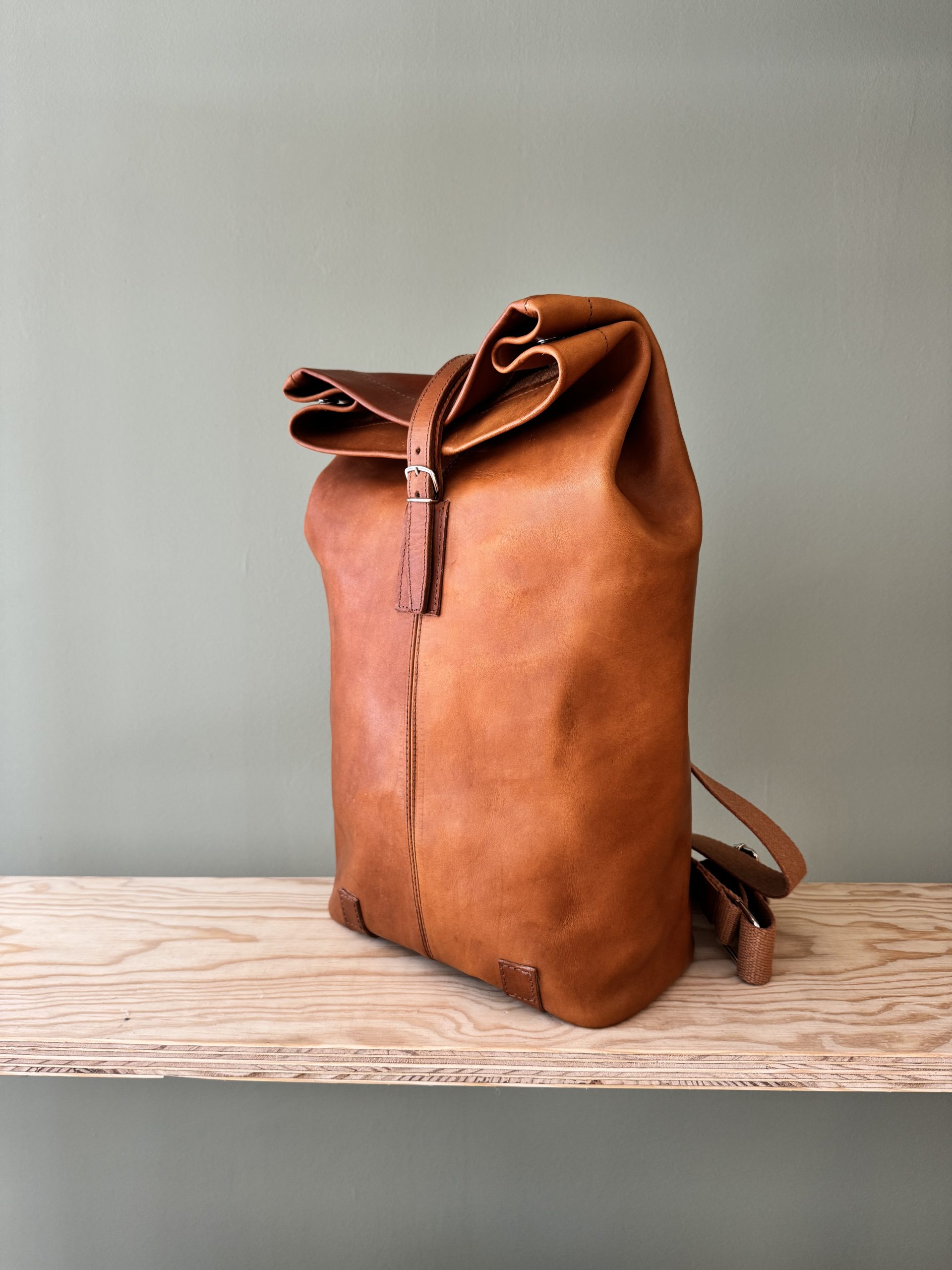 Der Rucksack aus hochwertigem Rindsleder besticht wegen seines schlichten Formats. Die Riementräger aus Leinen sind der gewollte Kontrast zum pflanzlich gegerbten Lederrucksack. Der Träger, als einziges von der Front sichtbares Element, lässt auf den ersten Blick nicht erahnen, was folgt.
