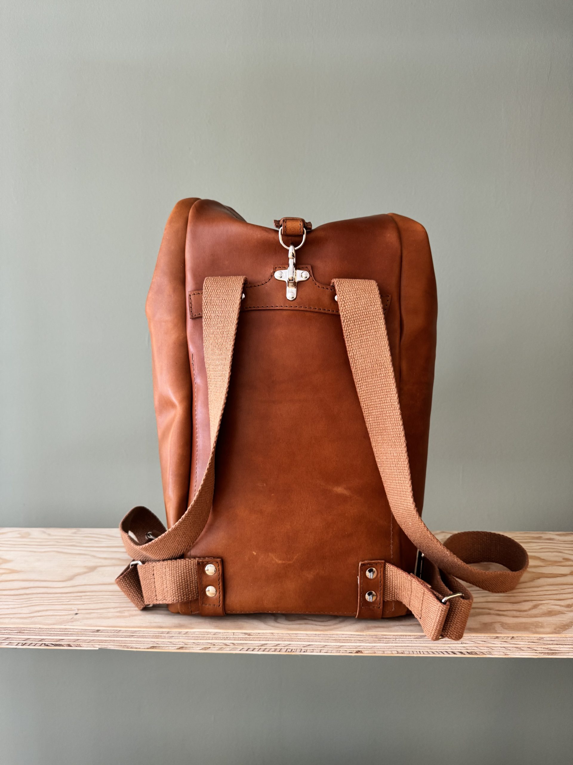 Die Kombination des Leders und der Stoffriemen, die darauf farblich abgestimmten Nähte, und die Verschlüsse sowie Nieten aus Metall machen den Rucksack einzigartig. Einfach, edel, robust, langlebig und treu soll er sein. «Der Wert des Werks!»