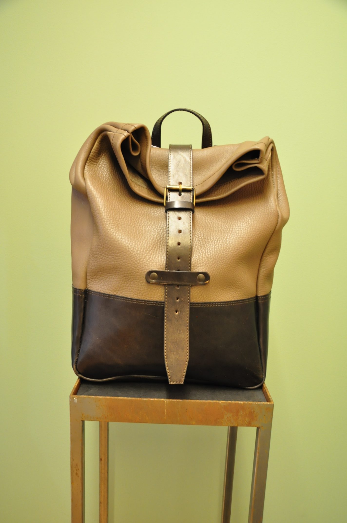 Der Rucksack aus hochwertigem Rindsleder besticht wegen seines schlichten Formats. Die Riementräger aus Leinen sind der gewollte Kontrast zum pflanzlich gegerbten Lederrucksack. Der Träger, als einziges von der Front sichtbares Element, lässt auf den ersten Blick nicht erahnen, was folgt.