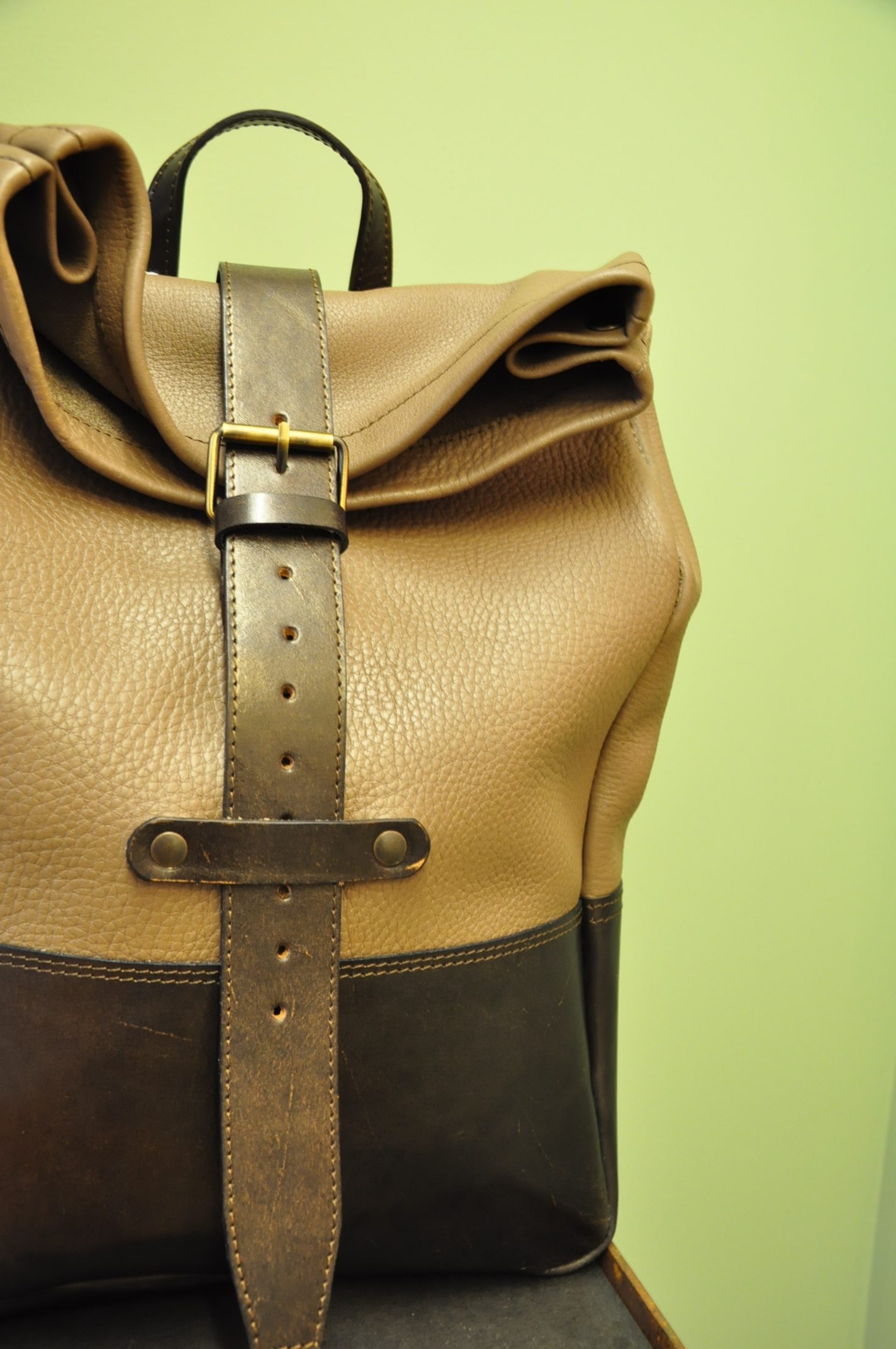 Die Kombination des Leders und der Stoffriemen, die darauf farblich abgestimmten Nähte, und die Verschlüsse sowie Nieten aus Metall machen den Rucksack einzigartig. Einfach, edel, robust, langlebig und treu soll er sein. «Der Wert des Werks!»