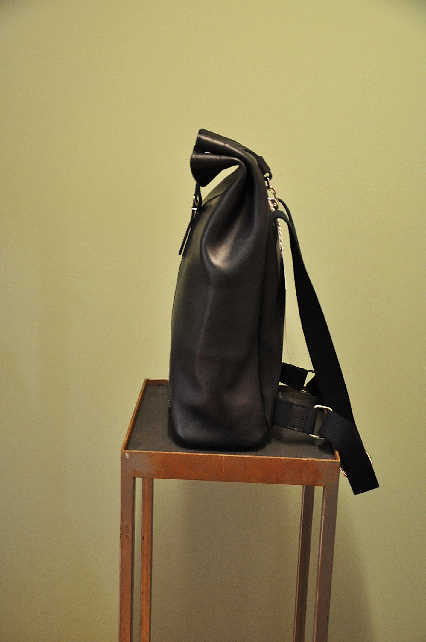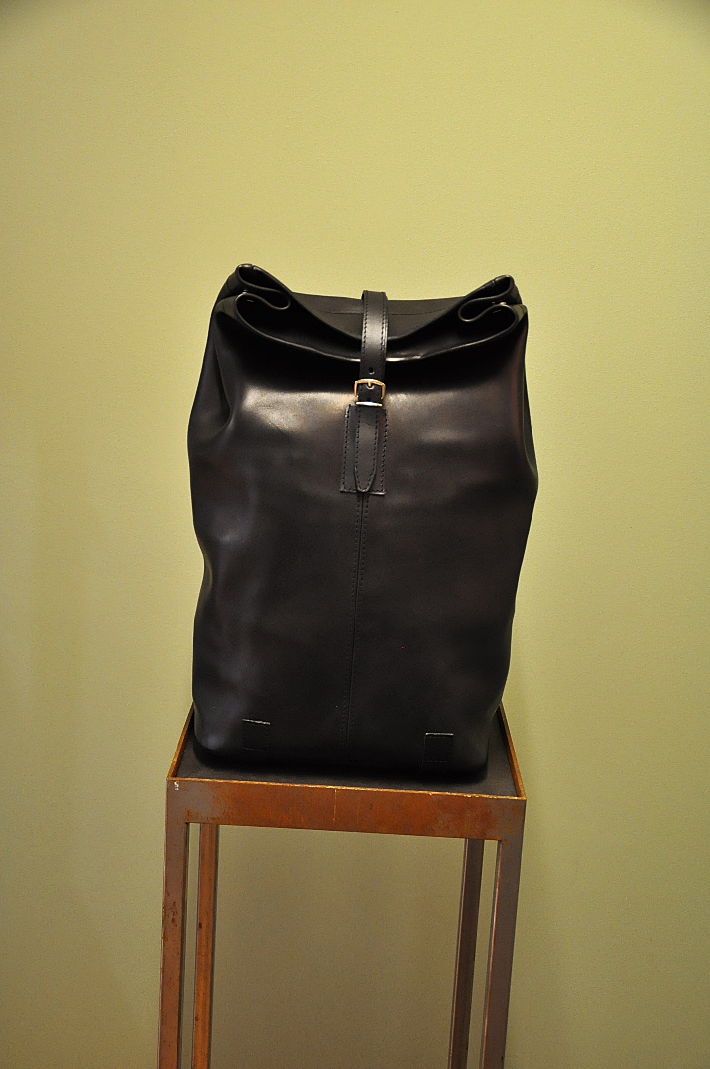 Der Rucksack aus hochwertigem Rindsleder besticht wegen seines schlichten Formats. Die Riementräger aus Leinen sind der gewollte Kontrast zum pflanzlich gegerbten Lederrucksack. Der Träger, als einziges von der Front sichtbares Element, lässt auf den ersten Blick nicht erahnen, was folgt.