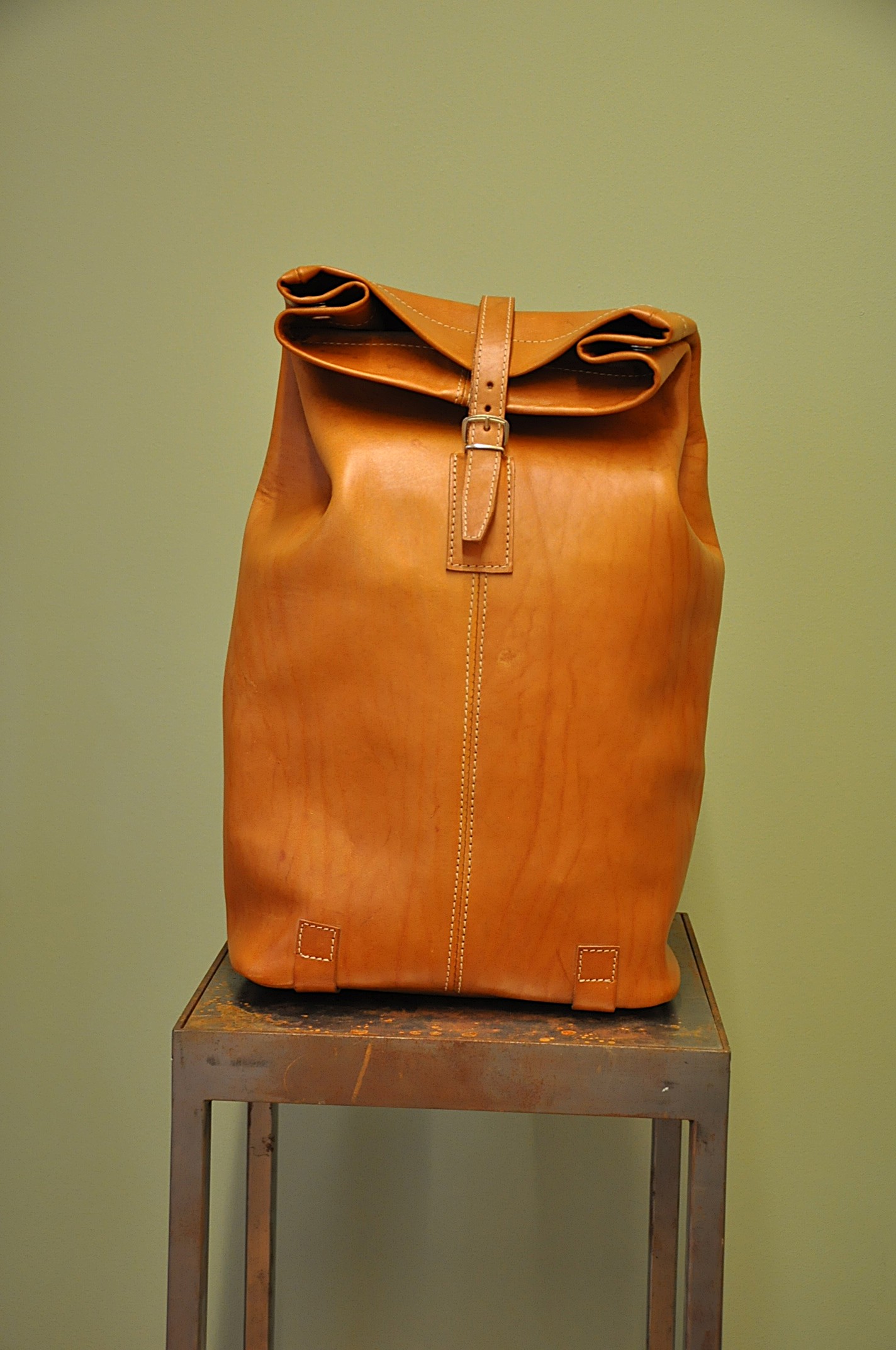 Der Rucksack aus hochwertigem Rindsleder besticht wegen seines schlichten Formats. Die Riementräger aus Leinen sind der gewollte Kontrast zum pflanzlich gegerbten Lederrucksack. Der Träger, als einziges von der Front sichtbares Element, lässt auf den ersten Blick nicht erahnen, was folgt.