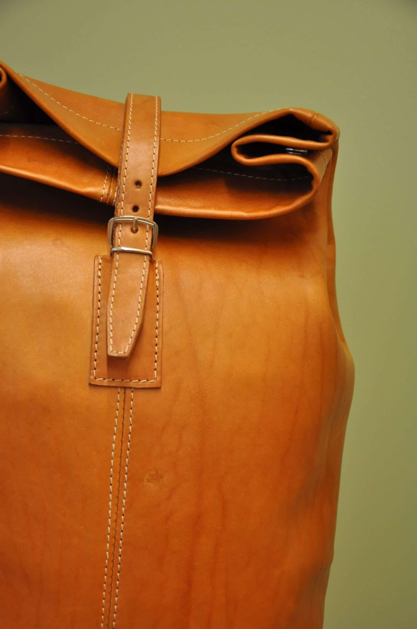 Die Kombination des Leders und der Stoffriemen, die darauf farblich abgestimmten Nähte, und die Verschlüsse sowie Nieten aus Metall machen den Rucksack einzigartig. Einfach, edel, robust, langlebig und treu soll er sein. «Der Wert des Werks!»