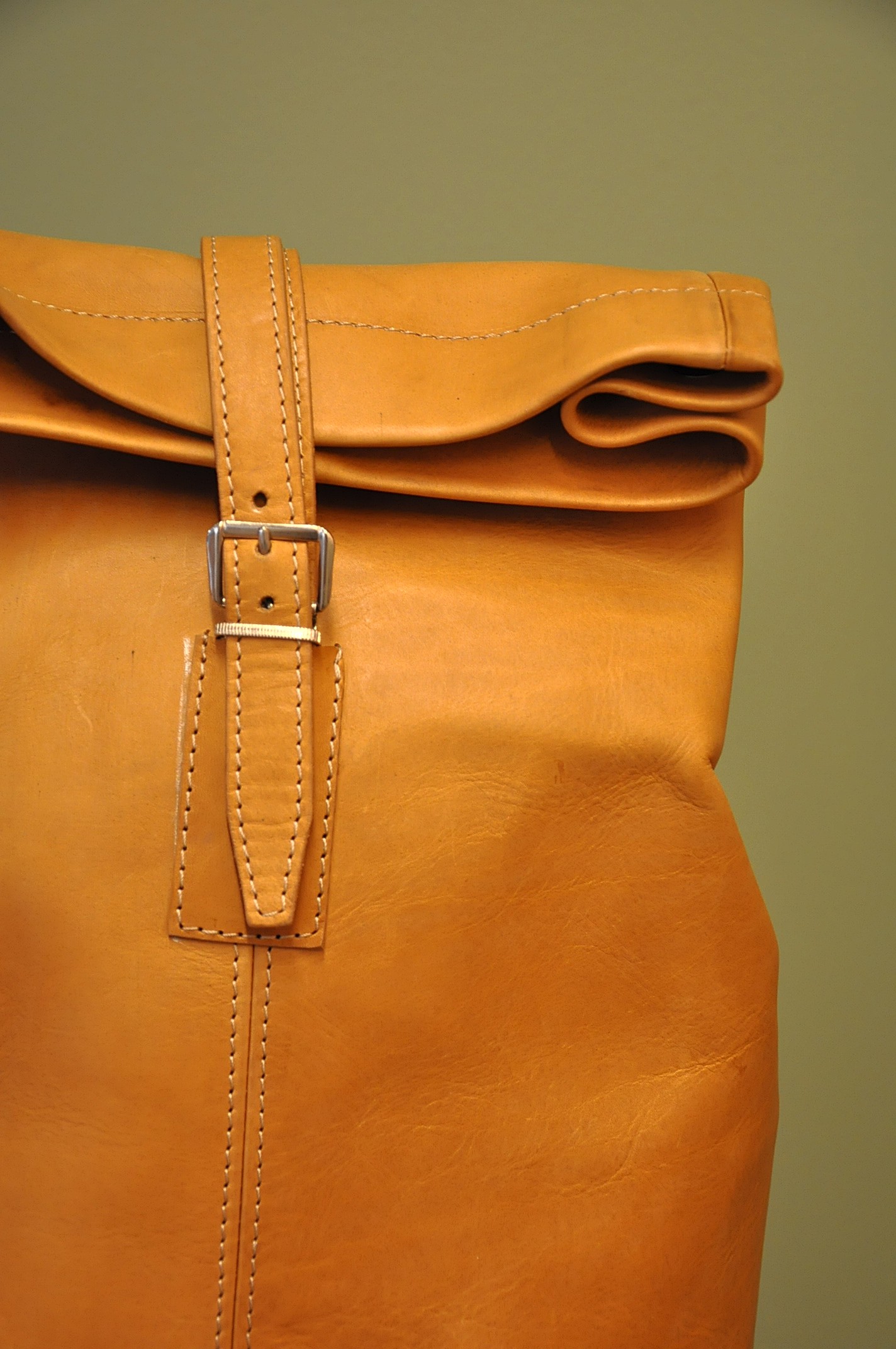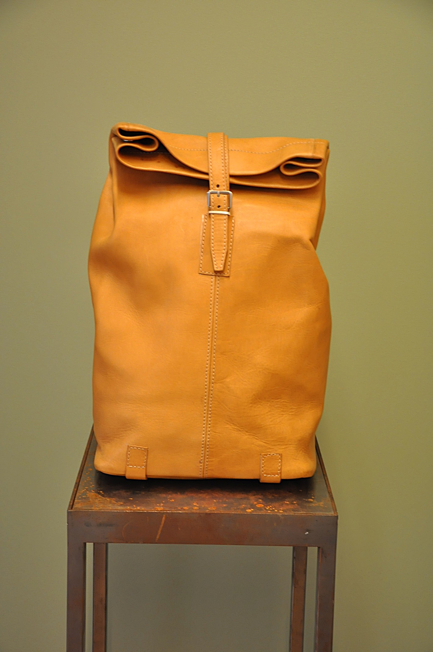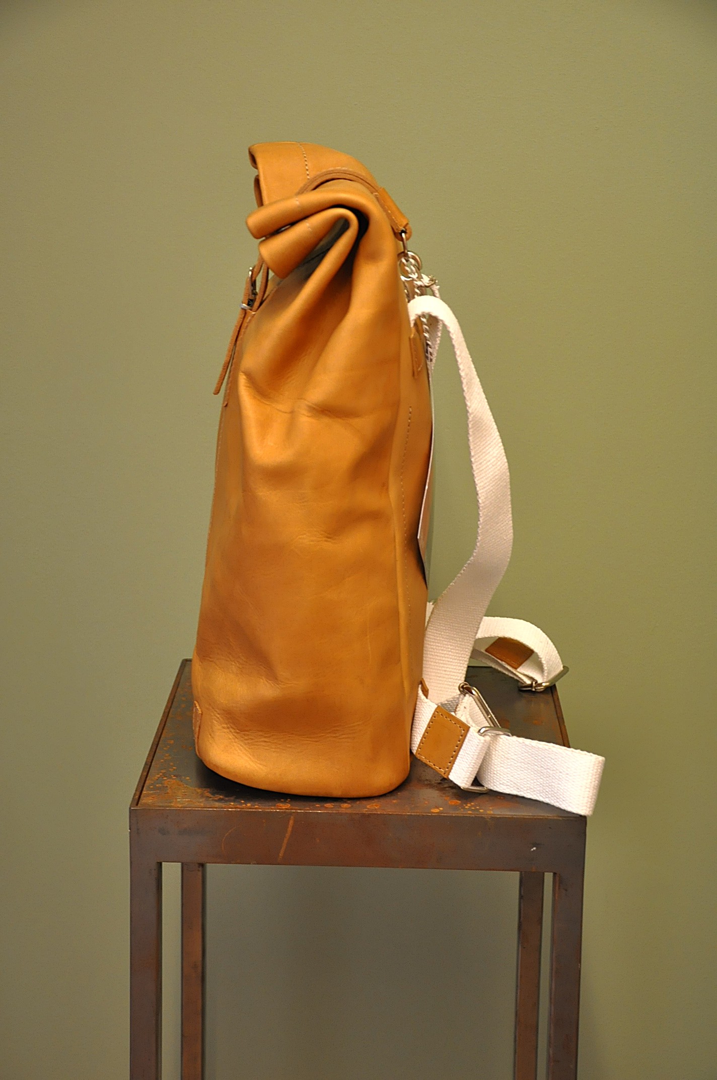 Der Rucksack aus hochwertigem Rindsleder besticht wegen seines schlichten Formats. Die Riementräger aus Leinen sind der gewollte Kontrast zum pflanzlich gegerbten Lederrucksack. Der Träger, als einziges von der Front sichtbares Element, lässt auf den ersten Blick nicht erahnen, was folgt.