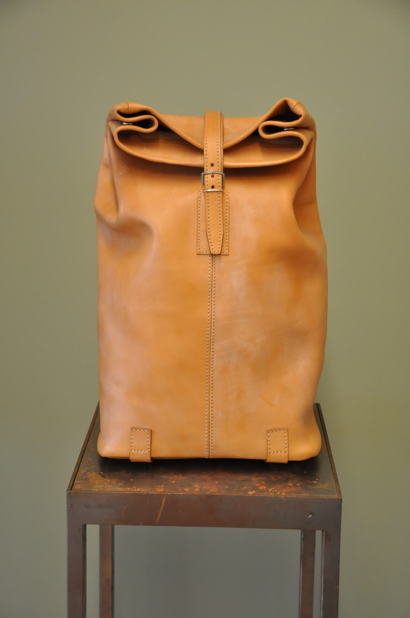 Der Rucksack aus hochwertigem Rindsleder besticht wegen seines schlichten Formats. Die Riementräger aus Leinen sind der gewollte Kontrast zum pflanzlich gegerbten Lederrucksack. Der Träger, als einziges von der Front sichtbares Element, lässt auf den ersten Blick nicht erahnen, was folgt.