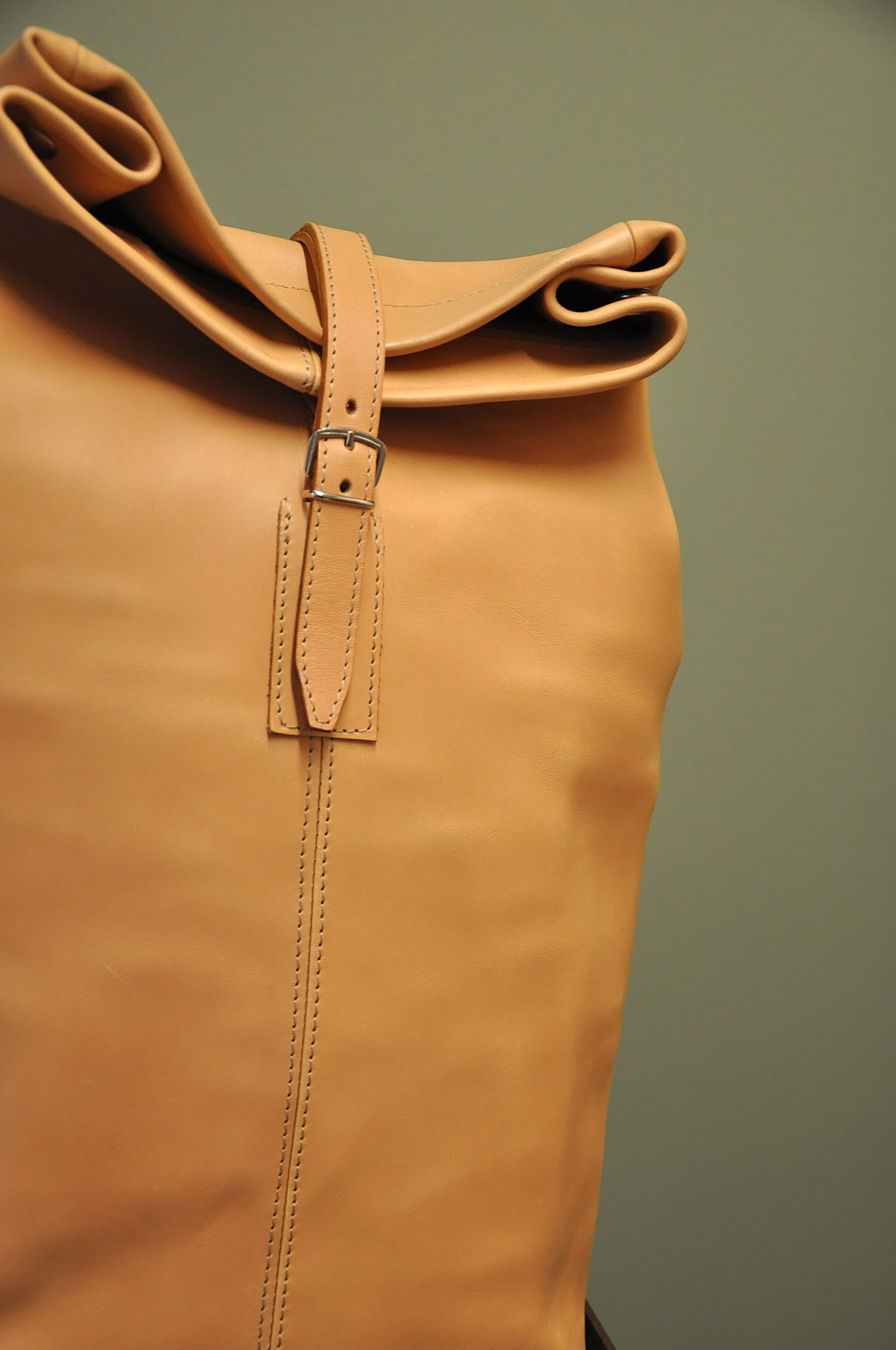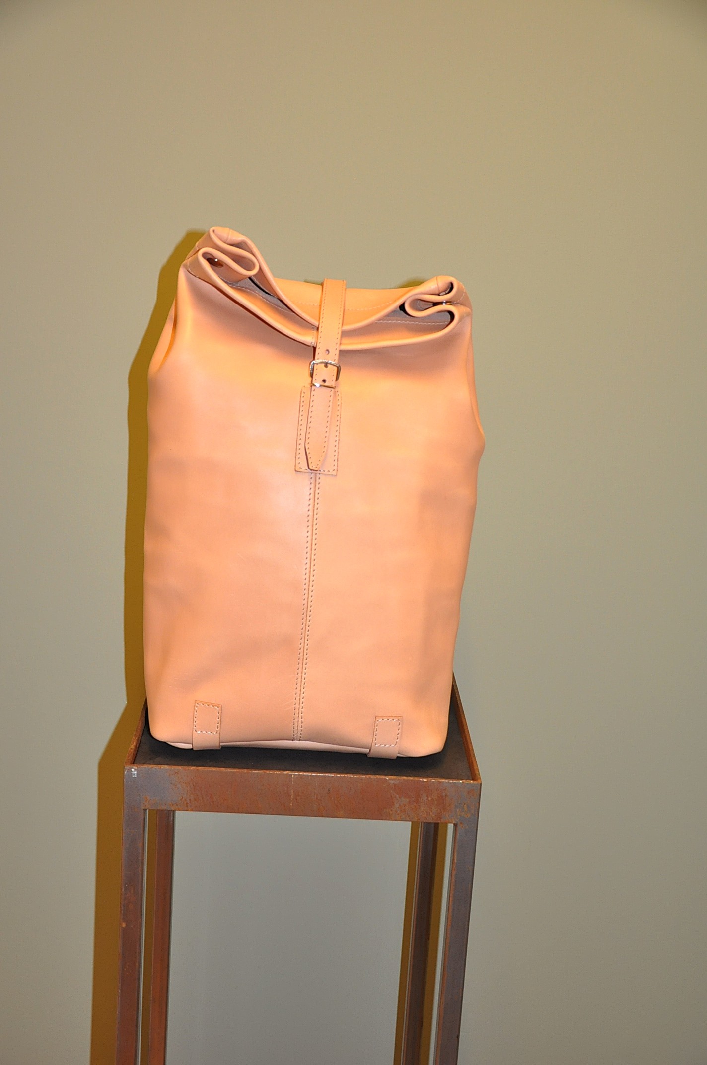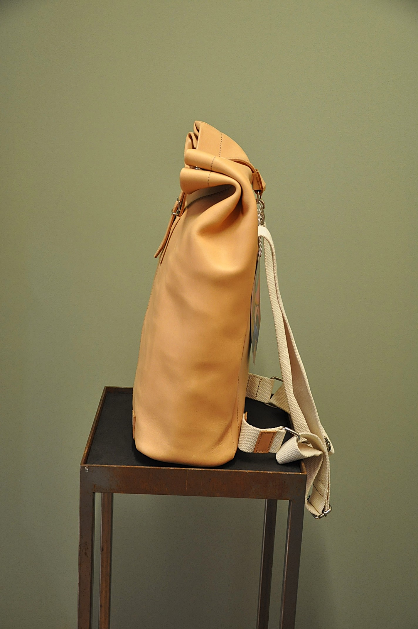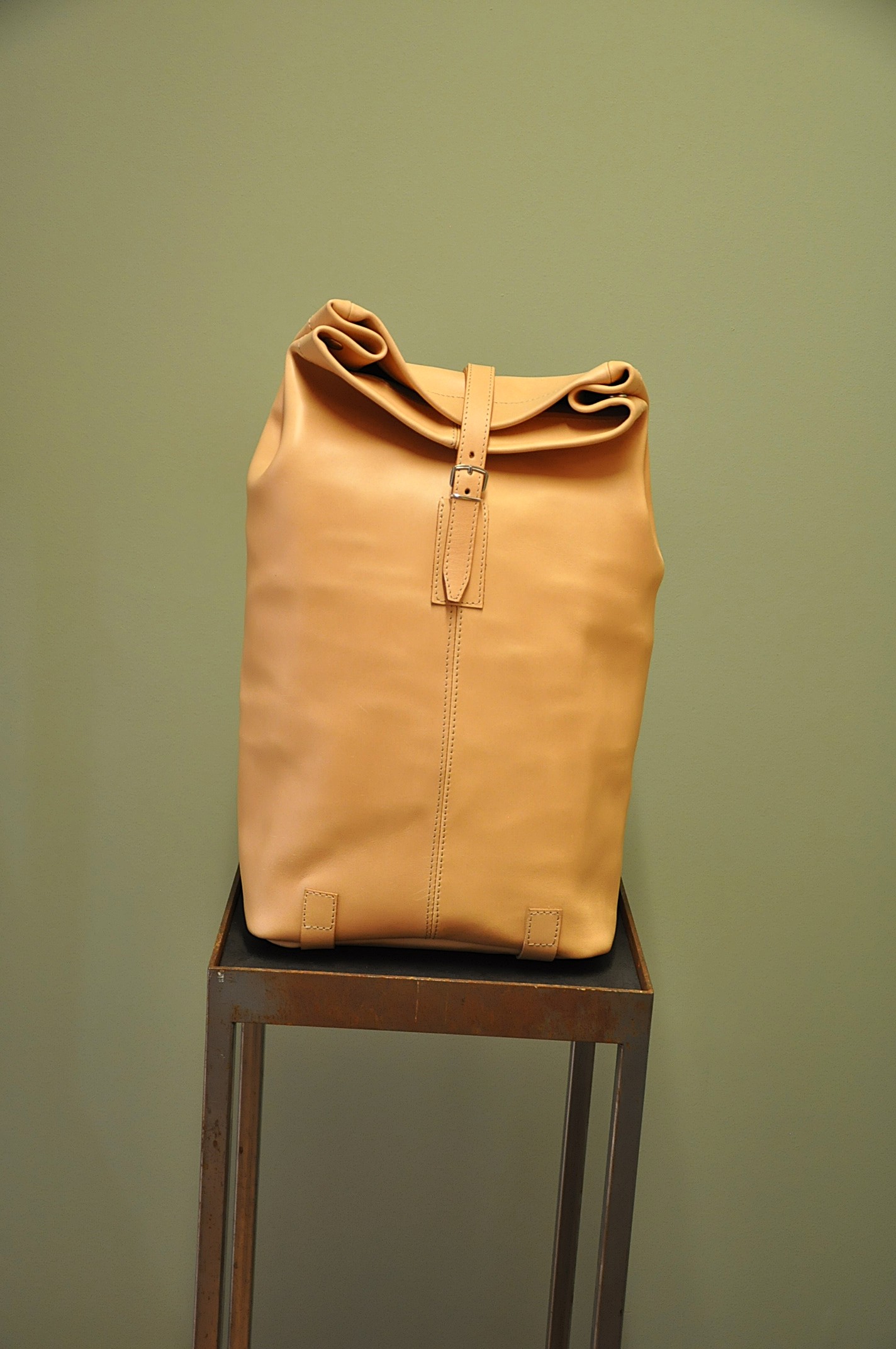 Der Rucksack aus hochwertigem Rindsleder besticht wegen seines schlichten Formats. Die Riementräger aus Leinen sind der gewollte Kontrast zum pflanzlich gegerbten Lederrucksack. Der Träger, als einziges von der Front sichtbares Element, lässt auf den ersten Blick nicht erahnen, was folgt.