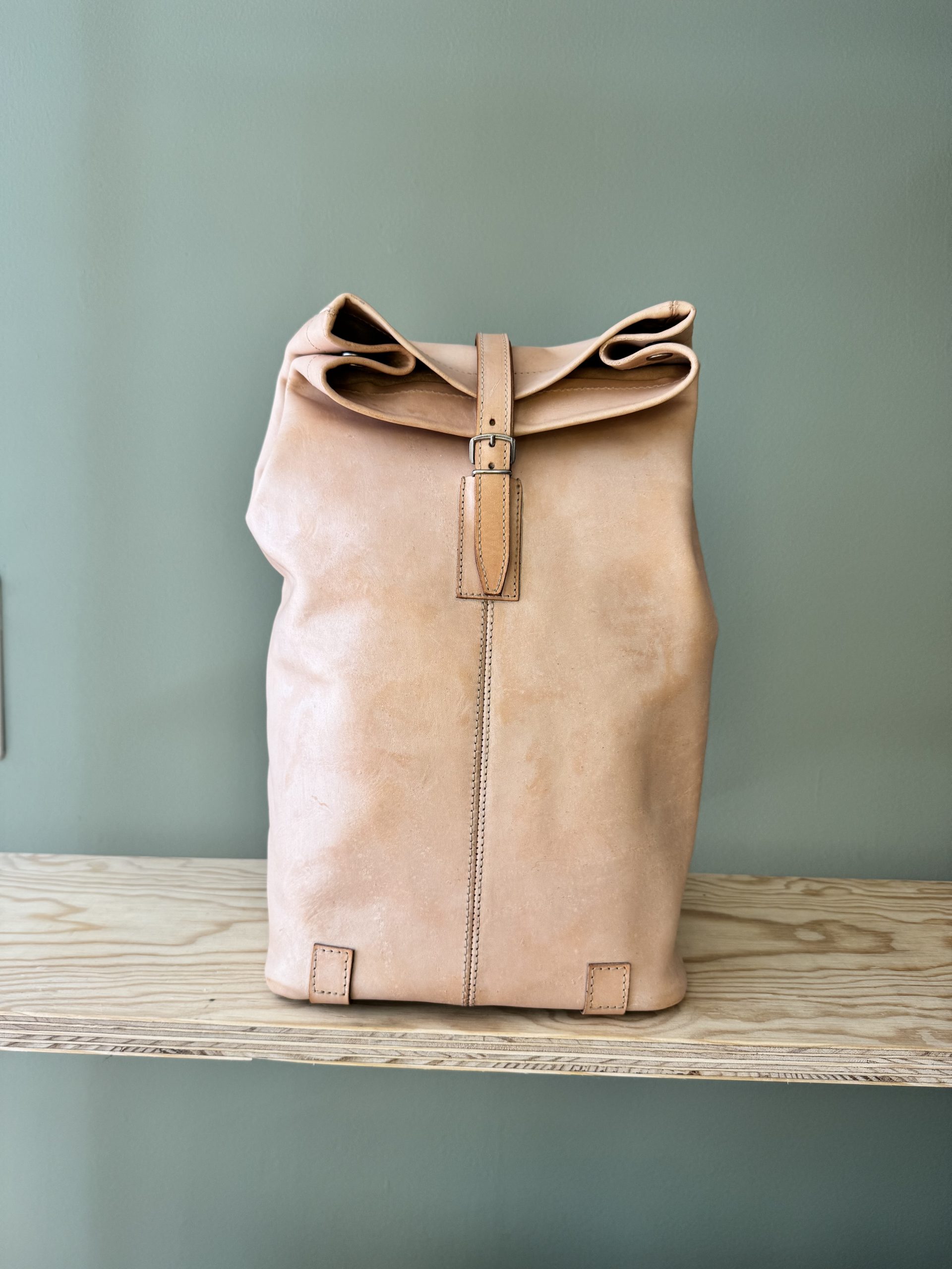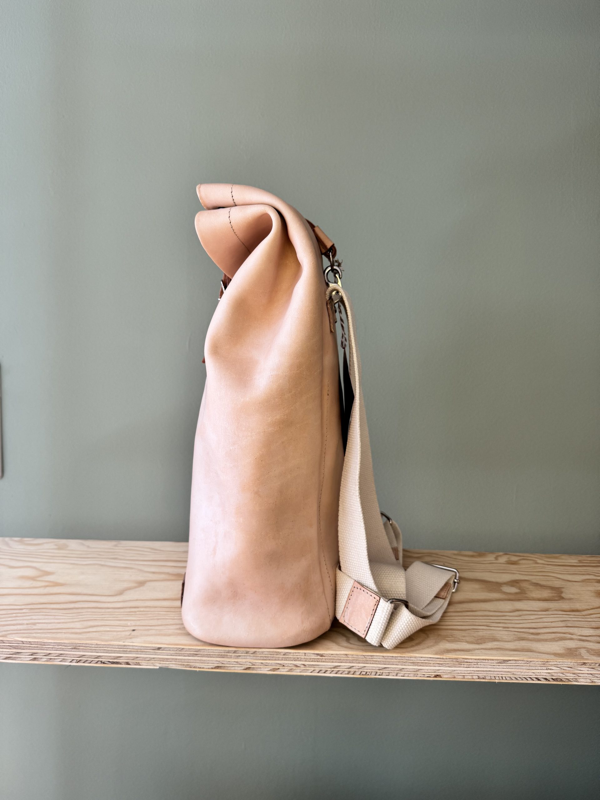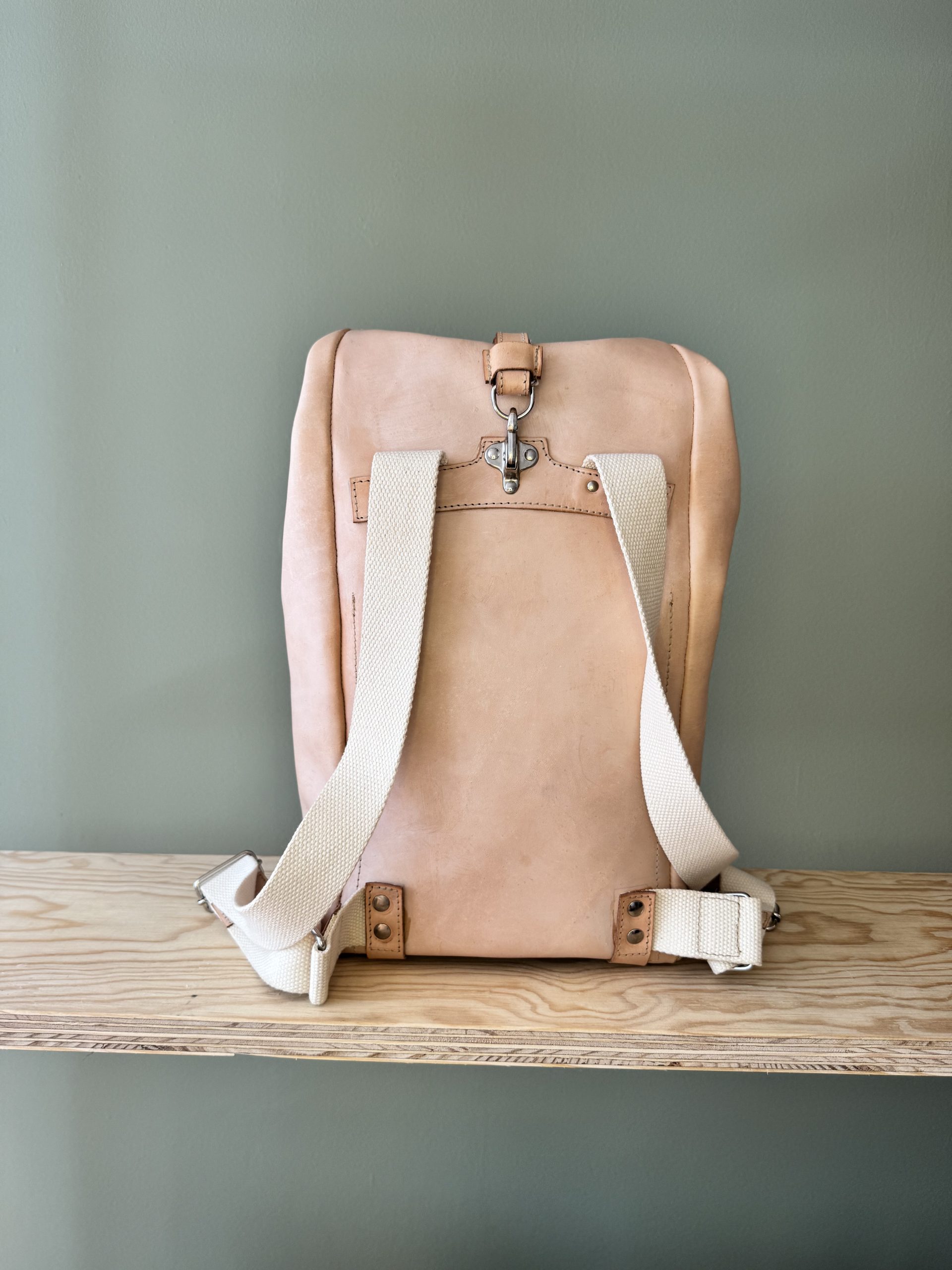 Der Rucksack aus hochwertigem Rindsleder besticht wegen seines schlichten Formats. Die Riementräger aus Leinen sind der gewollte Kontrast zum pflanzlich gegerbten Lederrucksack. Der Träger, als einziges von der Front sichtbares Element, lässt auf den ersten Blick nicht erahnen, was folgt.