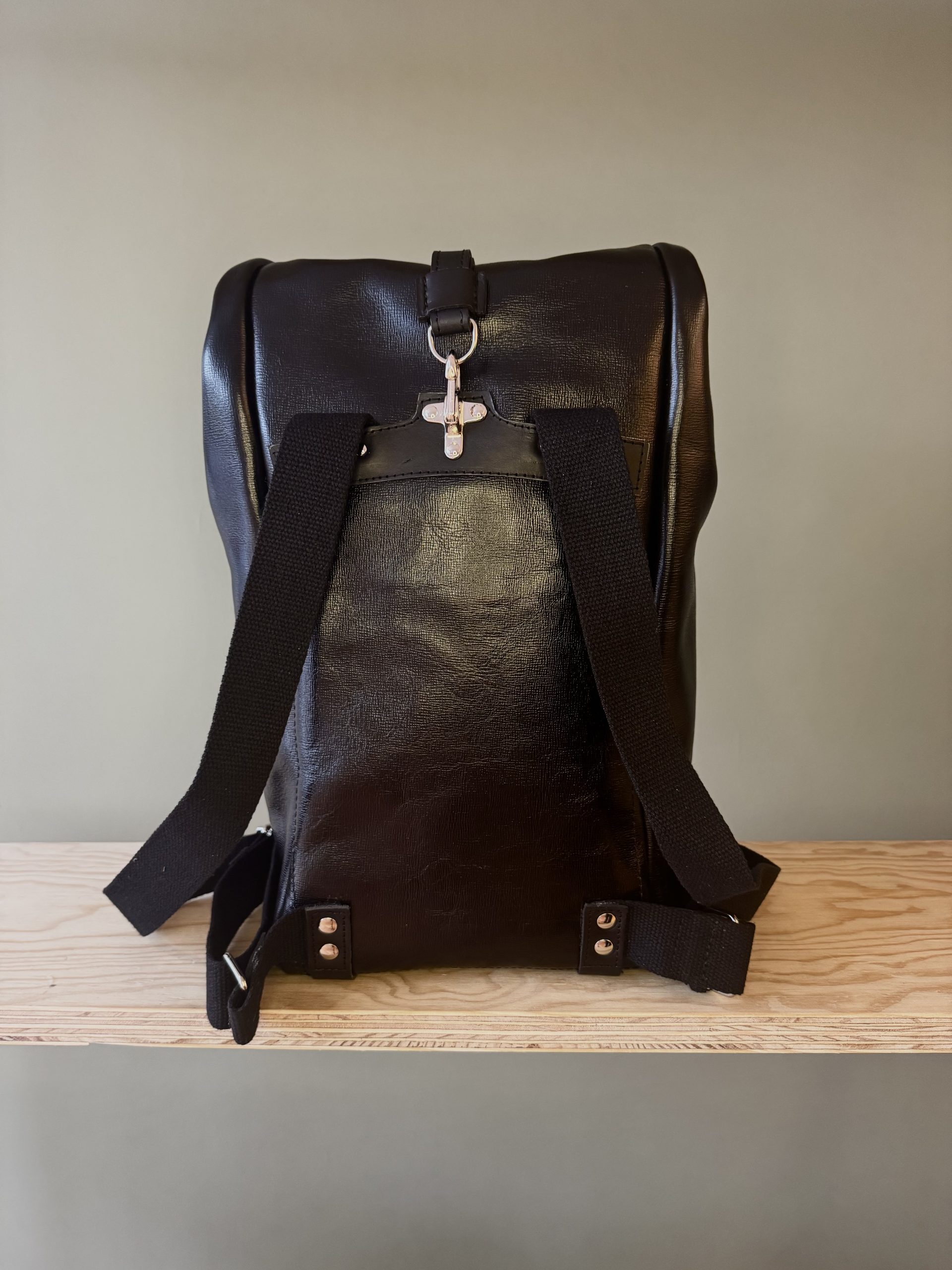 Die Kombination des Leders und der Stoffriemen, die darauf farblich abgestimmten Nähte, und die Verschlüsse sowie Nieten aus Metall machen den Rucksack einzigartig. Einfach, edel, robust, langlebig und treu soll er sein. «Der Wert des Werks!»