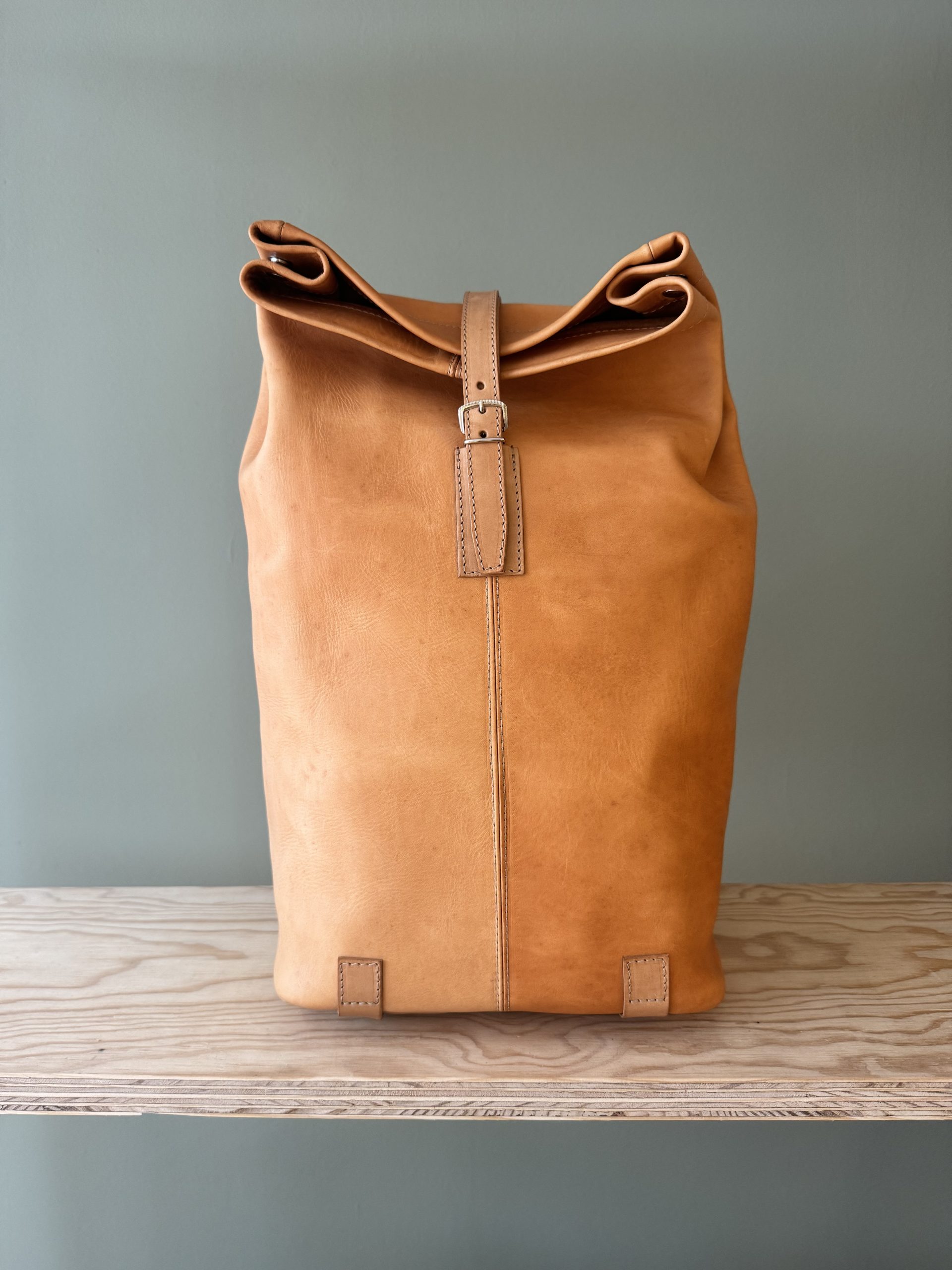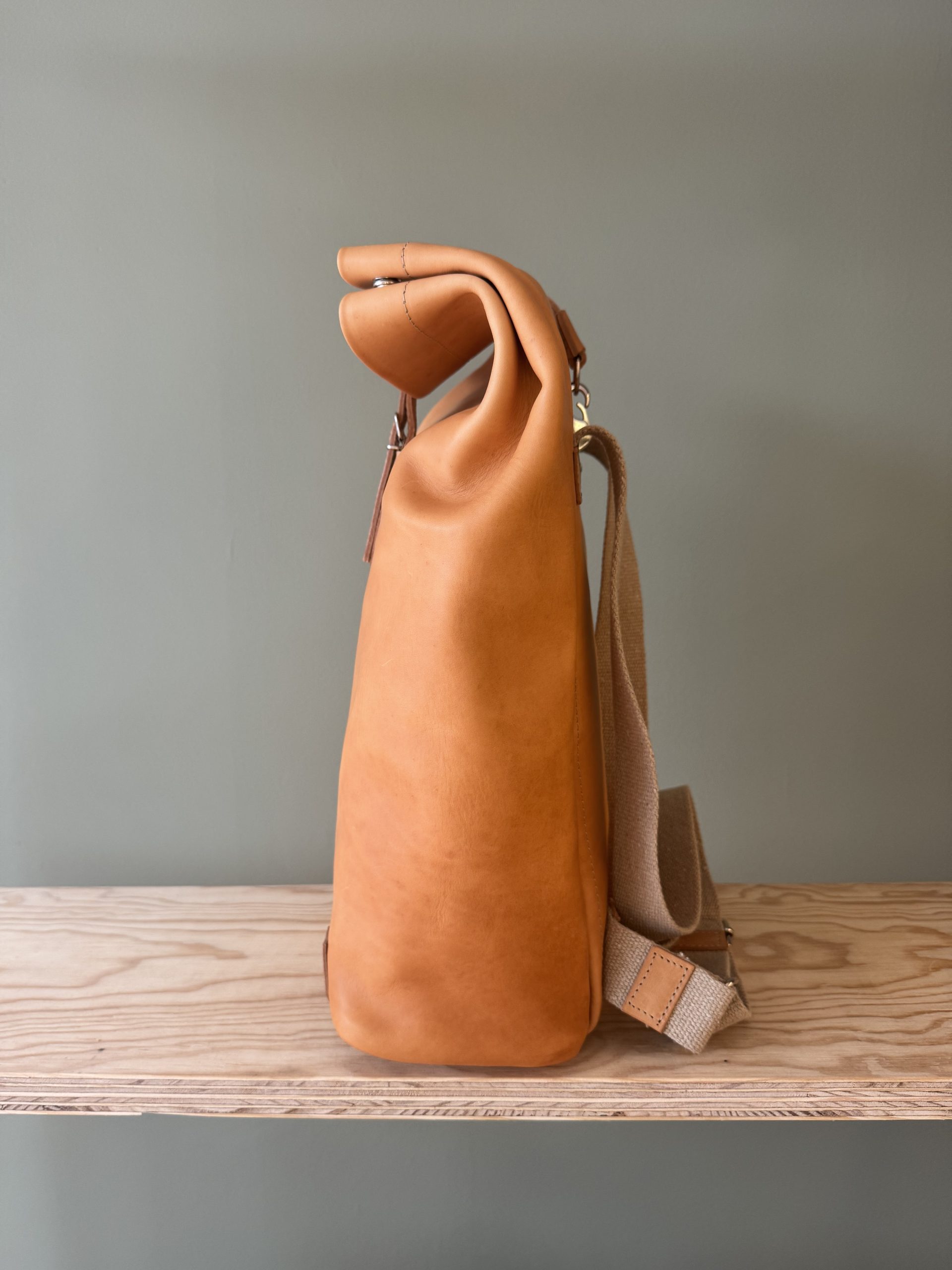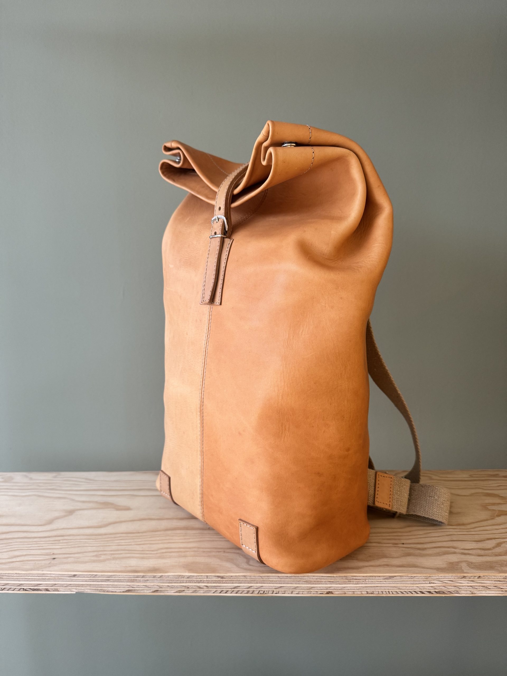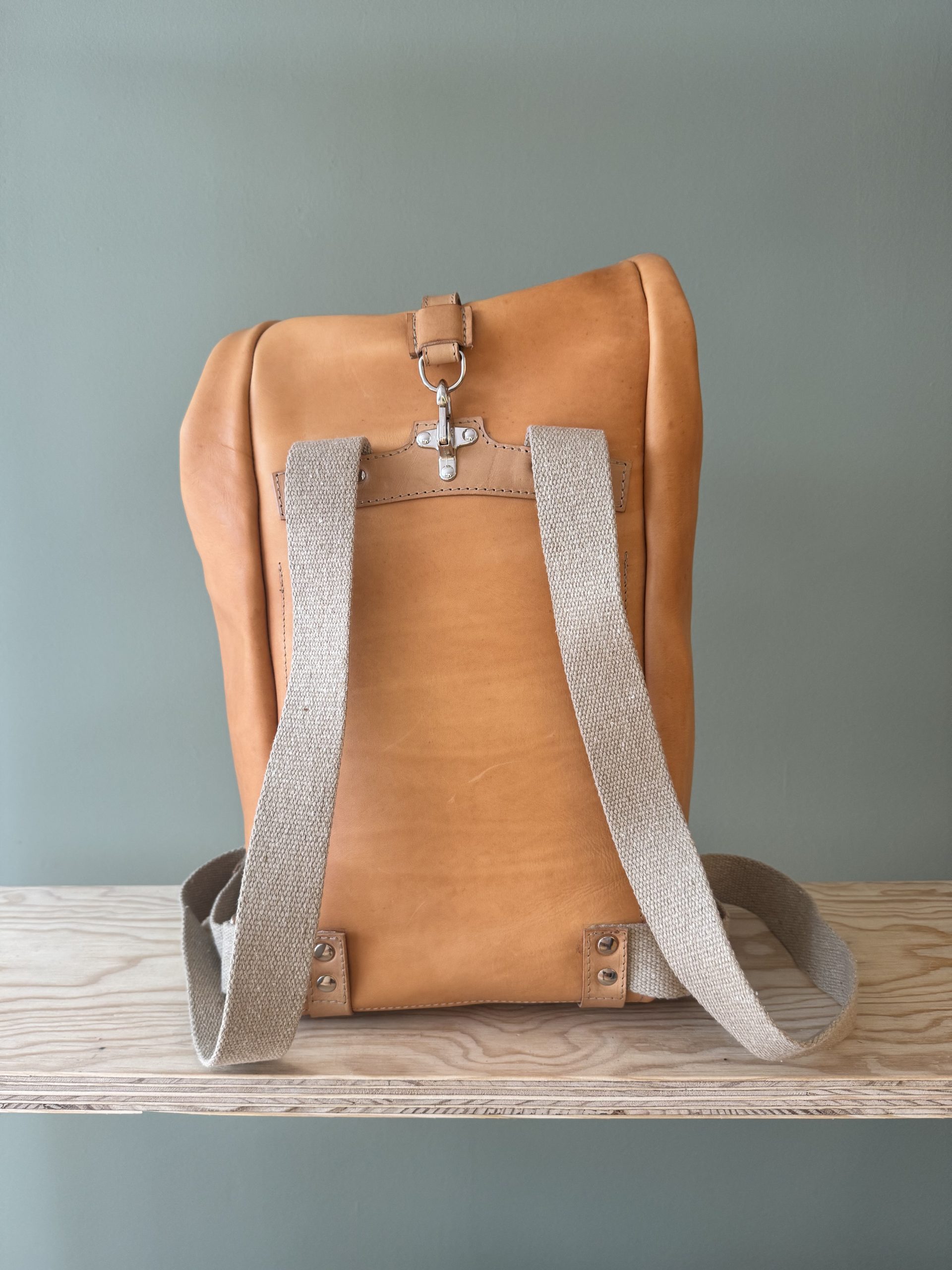 Der Rucksack aus hochwertigem Rindsleder besticht wegen seines schlichten Formats. Die Riementräger aus Leinen sind der gewollte Kontrast zum pflanzlich gegerbten Lederrucksack. Der Träger, als einziges von der Front sichtbares Element, lässt auf den ersten Blick nicht erahnen, was folgt.