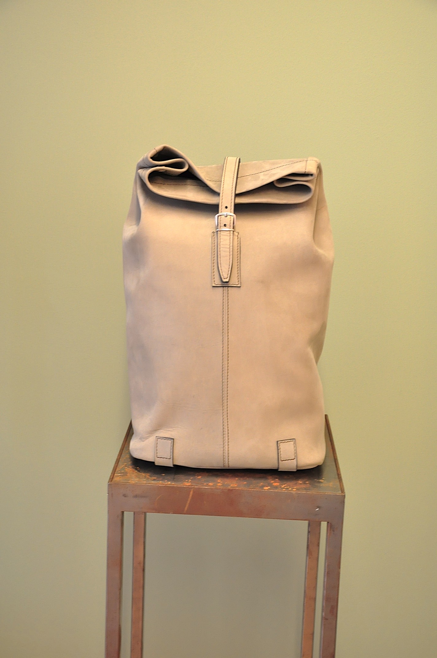 Der Rucksack aus hochwertigem Rindsleder besticht wegen seines schlichten Formats. Die Riementräger aus Leinen sind der gewollte Kontrast zum pflanzlich gegerbten Lederrucksack. Der Träger, als einziges von der Front sichtbares Element, lässt auf den ersten Blick nicht erahnen, was folgt.