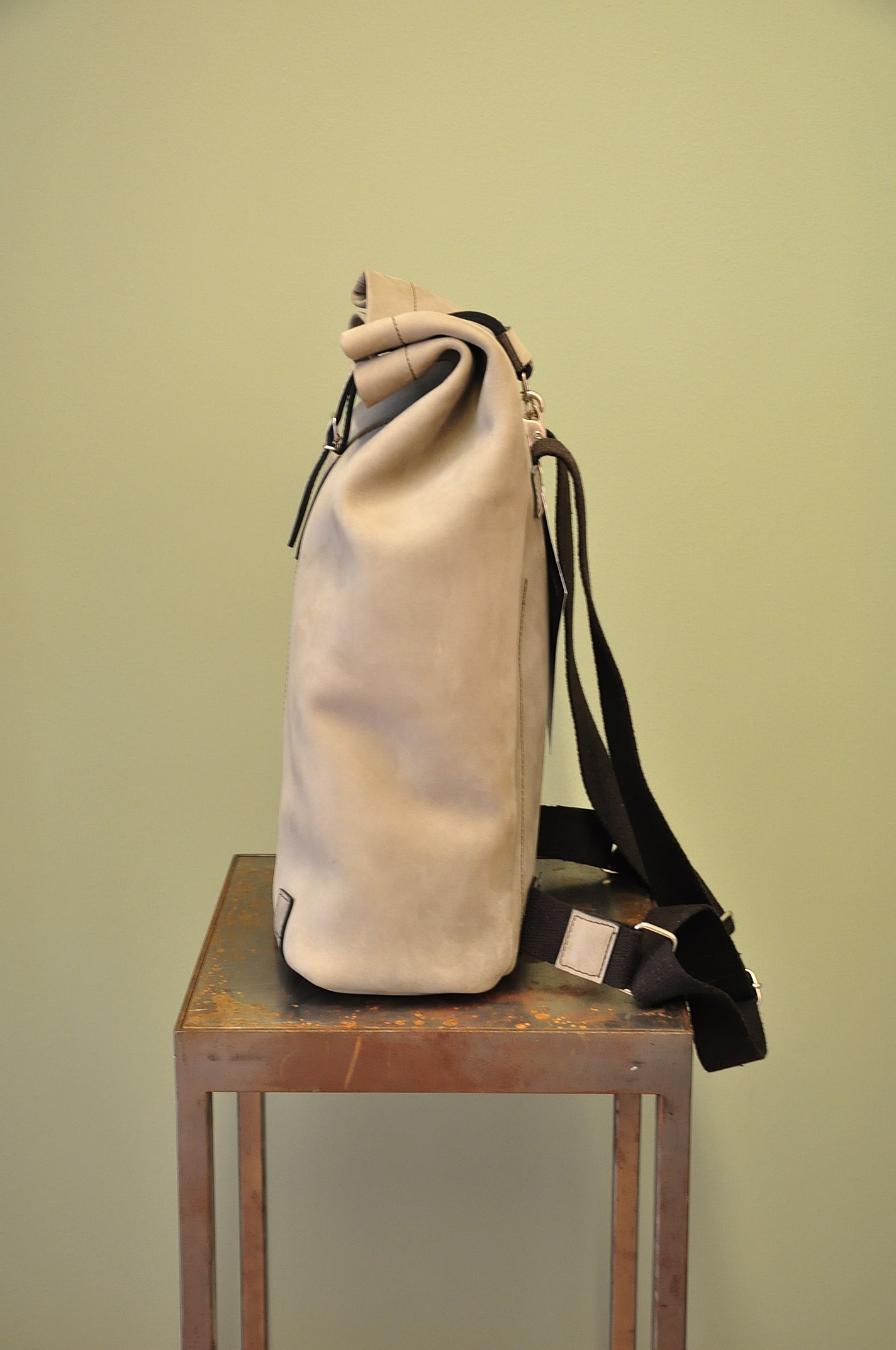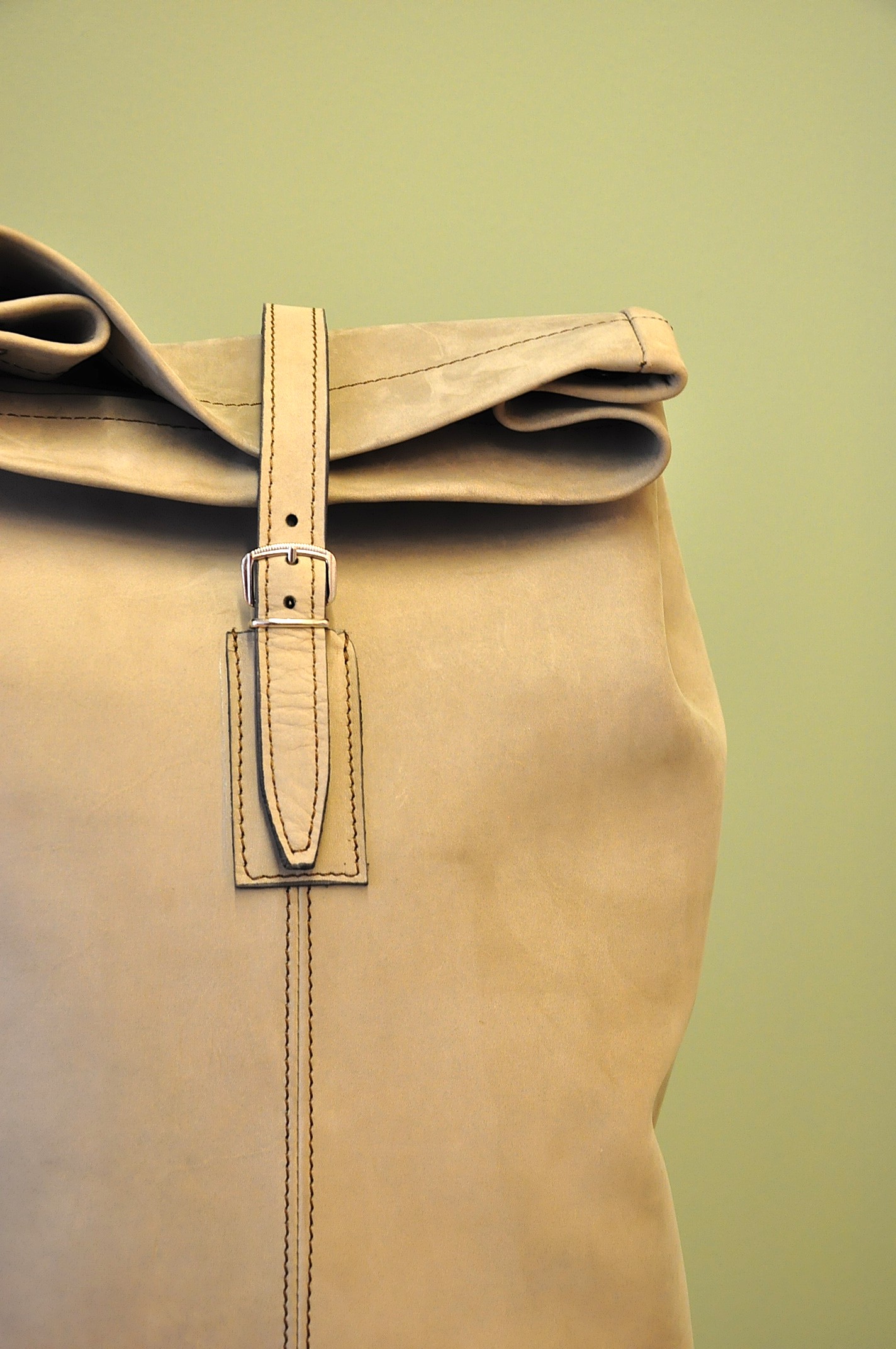 Die Kombination des Leders und der Stoffriemen, die darauf farblich abgestimmten Nähte, und die Verschlüsse sowie Nieten aus Metall machen den Rucksack einzigartig. Einfach, edel, robust, langlebig und treu soll er sein. «Der Wert des Werks!»
