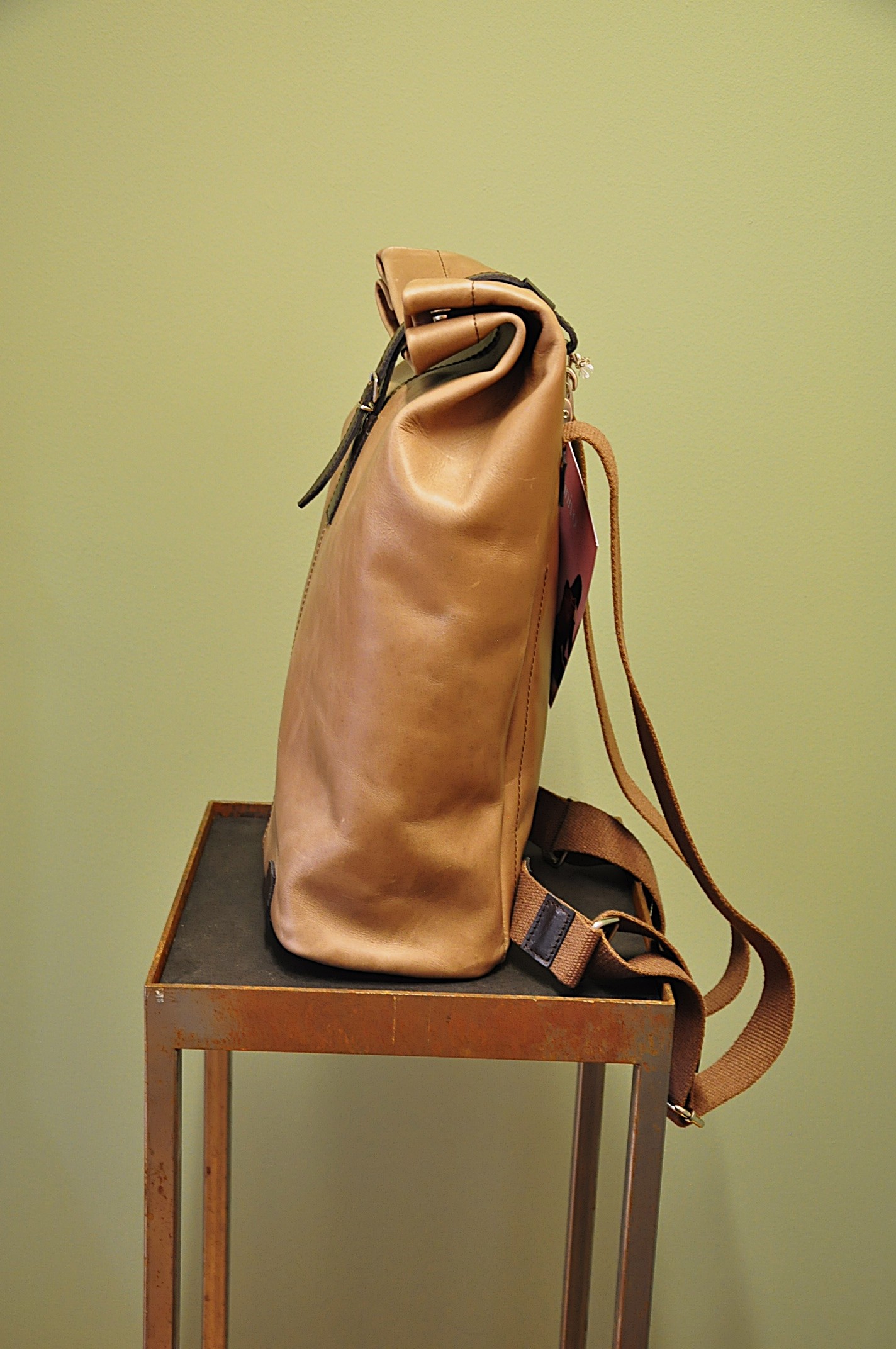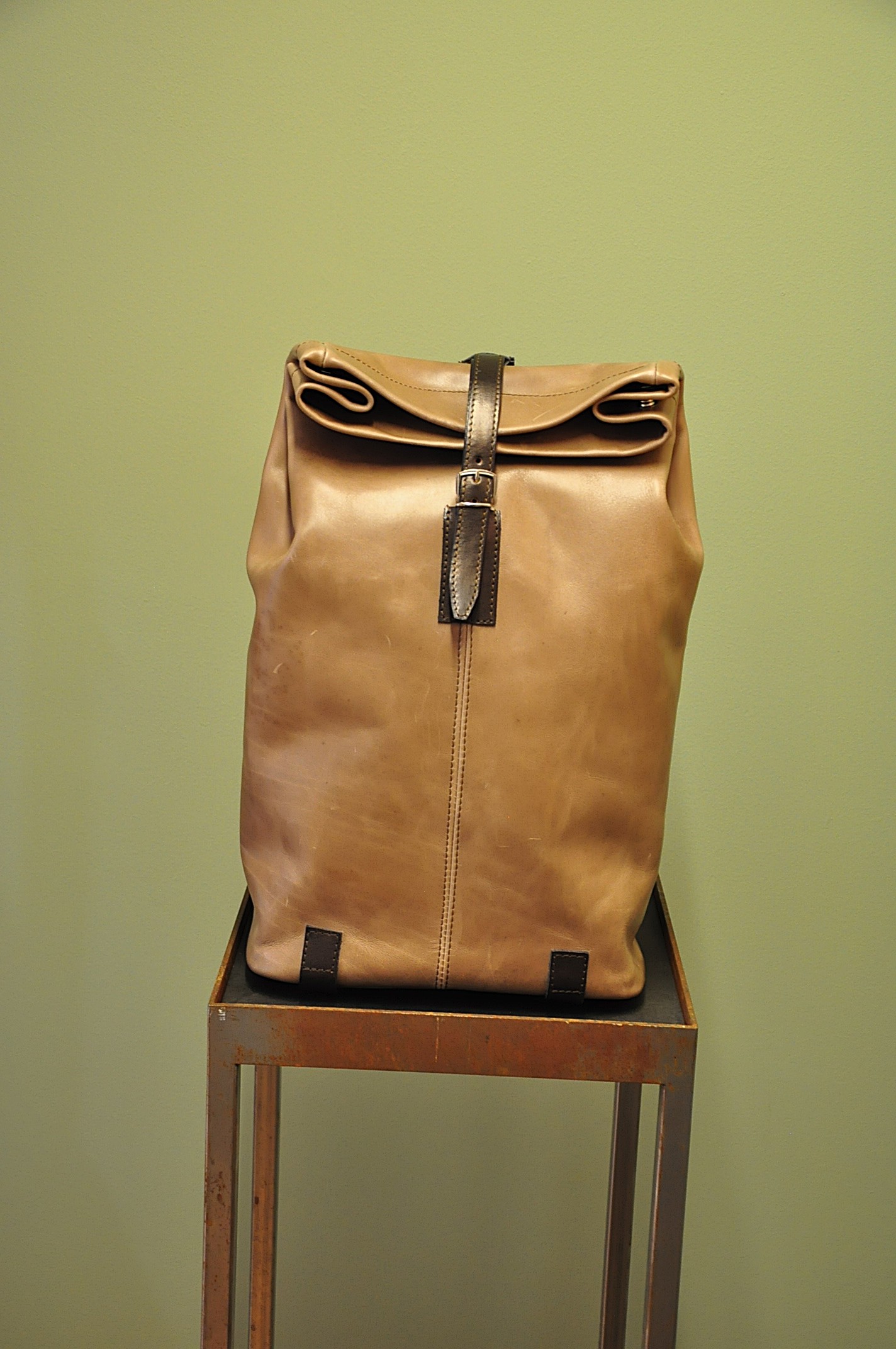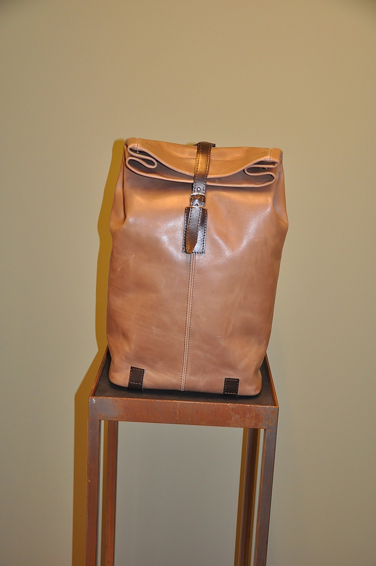 Der Rucksack aus hochwertigem Rindsleder besticht wegen seines schlichten Formats. Die Riementräger aus Leinen sind der gewollte Kontrast zum pflanzlich gegerbten Lederrucksack. Der Träger, als einziges von der Front sichtbares Element, lässt auf den ersten Blick nicht erahnen, was folgt.