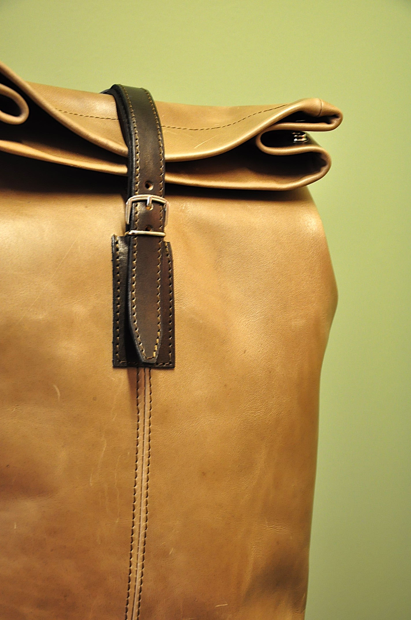 Die Kombination des Leders und der Stoffriemen, die darauf farblich abgestimmten Nähte, und die Verschlüsse sowie Nieten aus Metall machen den Rucksack einzigartig. Einfach, edel, robust, langlebig und treu soll er sein. «Der Wert des Werks!»