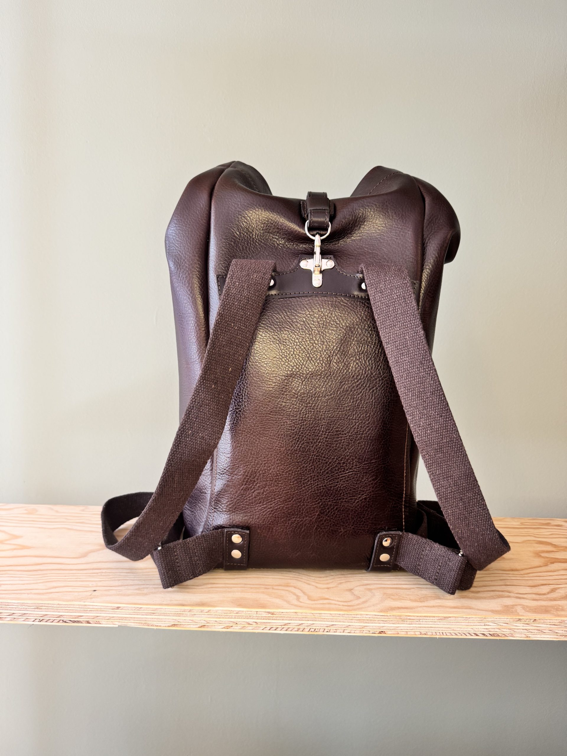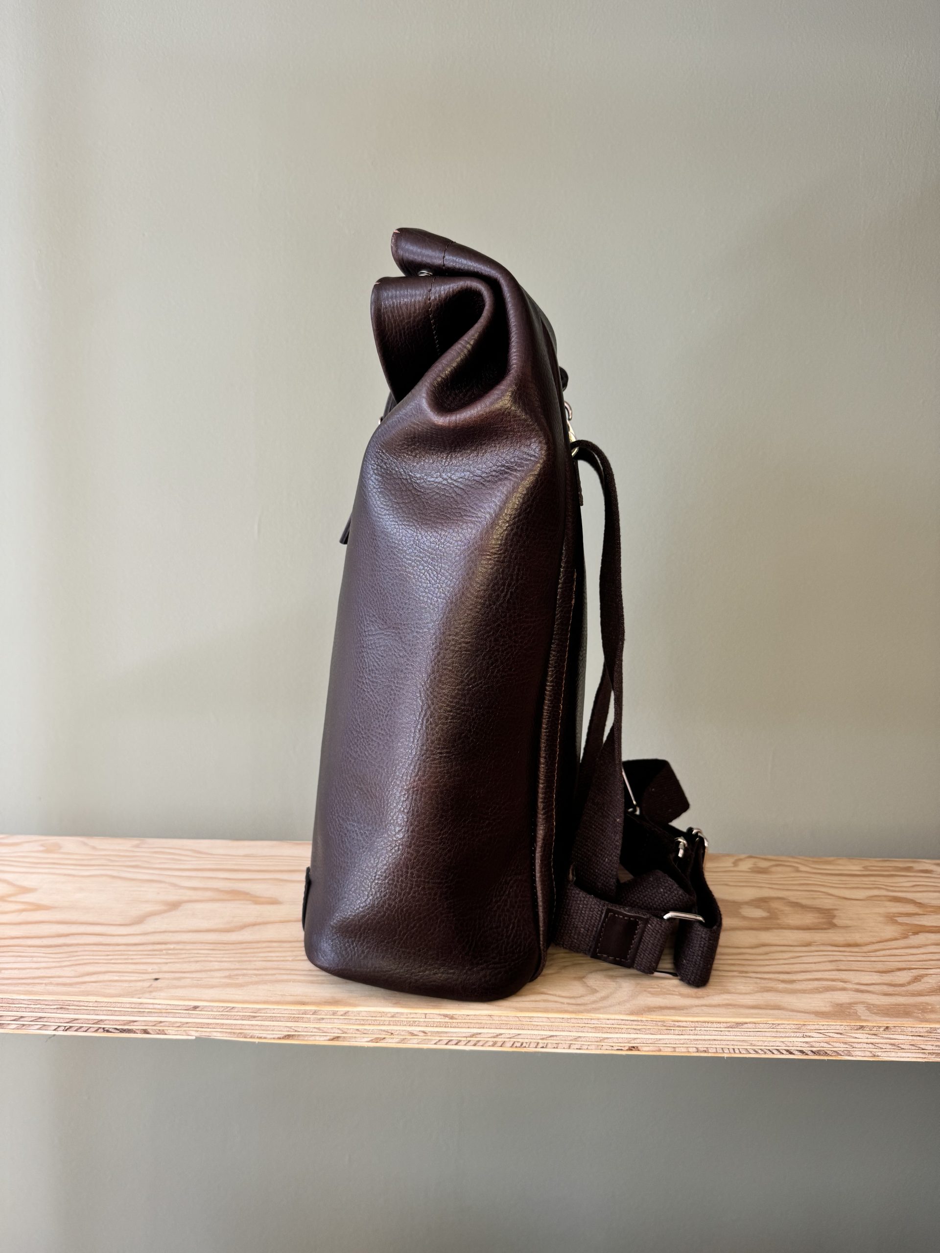 Der Rucksack aus hochwertigem Rindsleder besticht wegen seines schlichten Formats. Die Riementräger aus Leinen sind der gewollte Kontrast zum pflanzlich gegerbten Lederrucksack. Der Träger, als einziges von der Front sichtbares Element, lässt auf den ersten Blick nicht erahnen, was folgt.