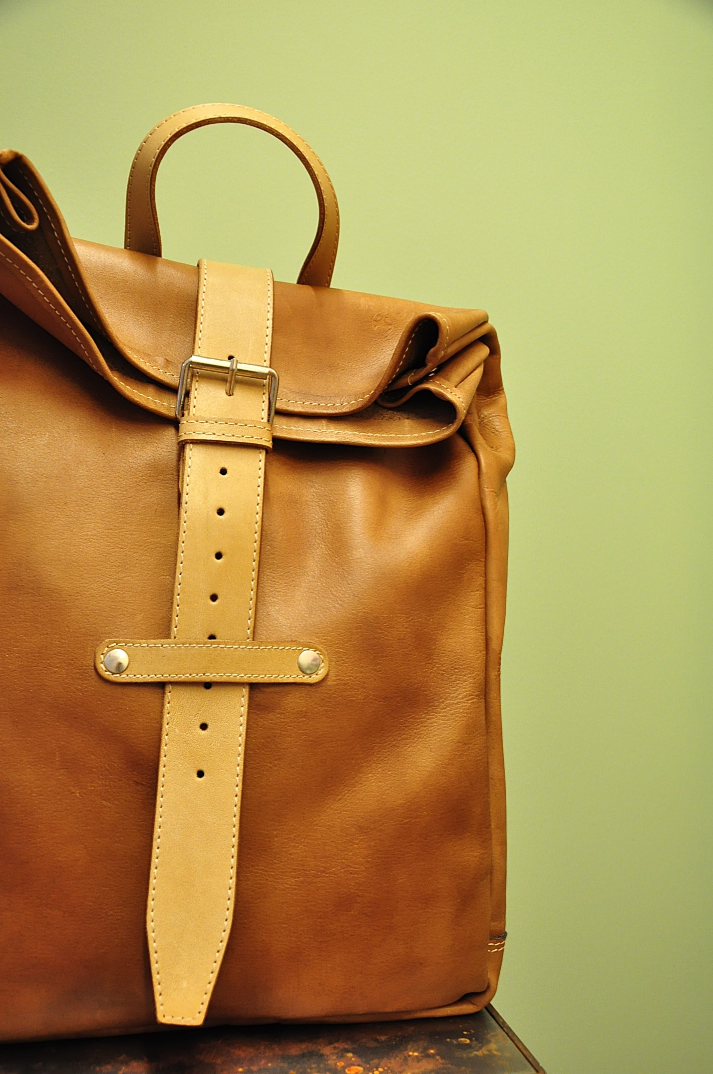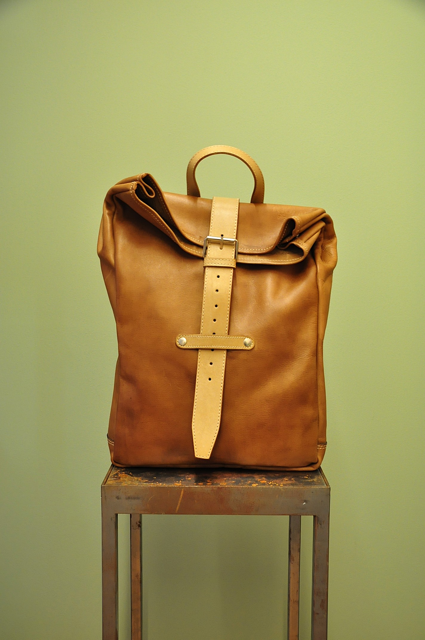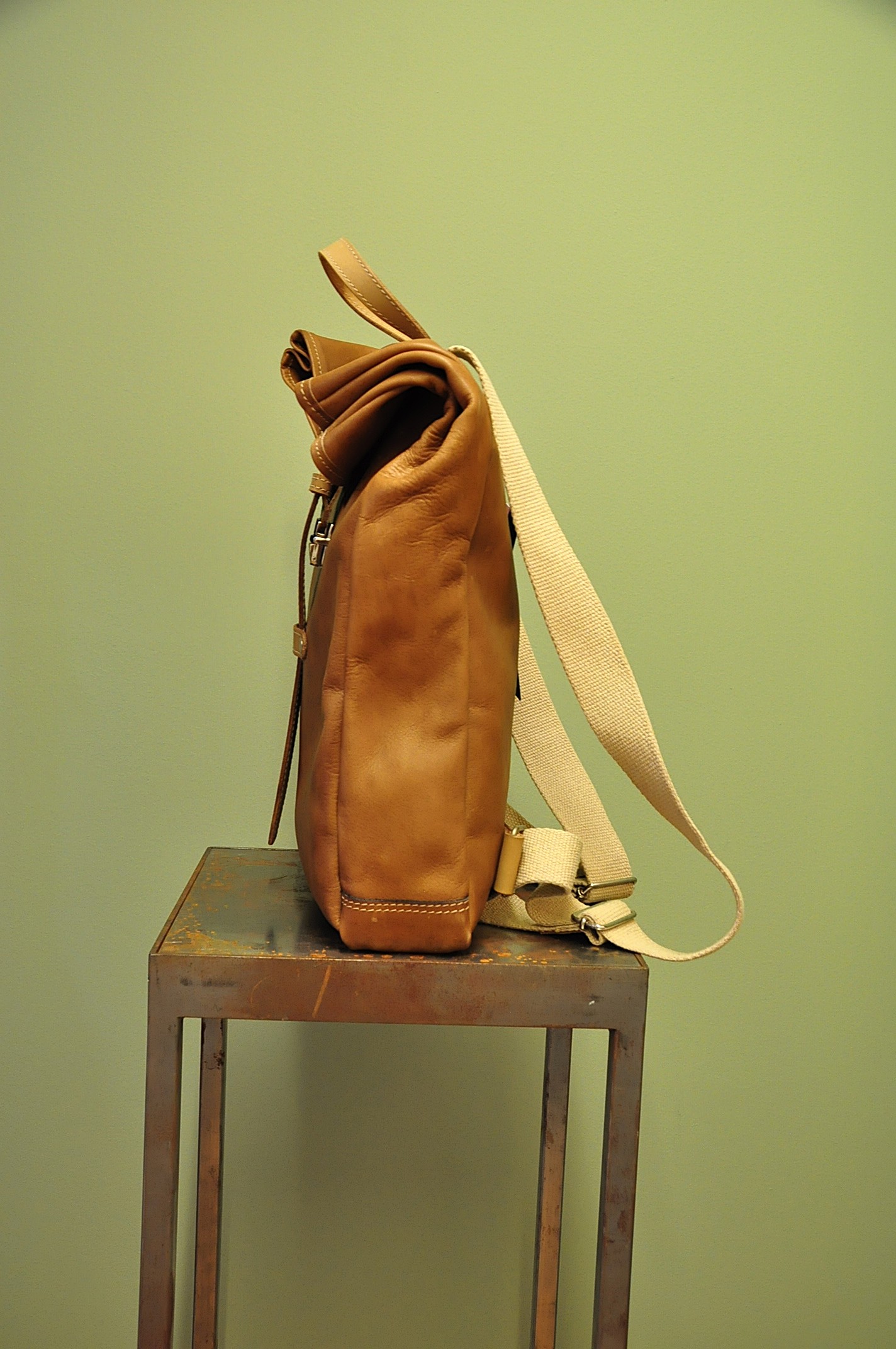Der Rucksack aus hochwertigem Rindsleder besticht wegen seines schlichten Formats. Die Riementräger aus Leinen sind der gewollte Kontrast zum pflanzlich gegerbten Lederrucksack. Der Träger, als einziges von der Front sichtbares Element, lässt auf den ersten Blick nicht erahnen, was folgt.