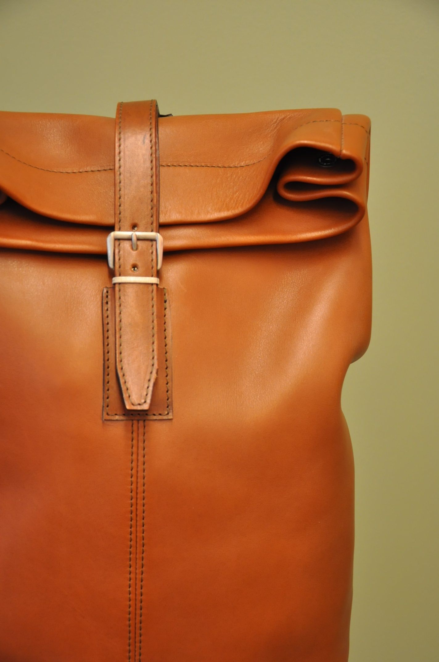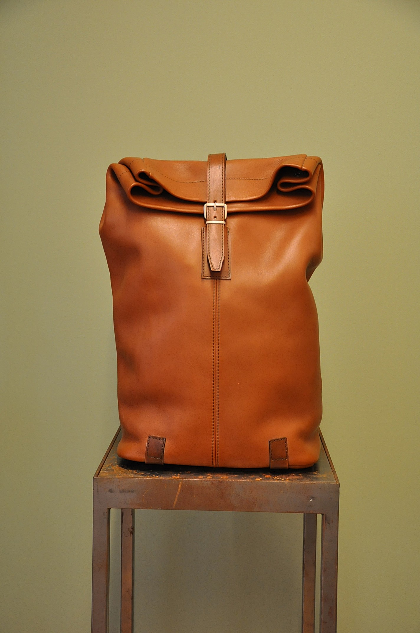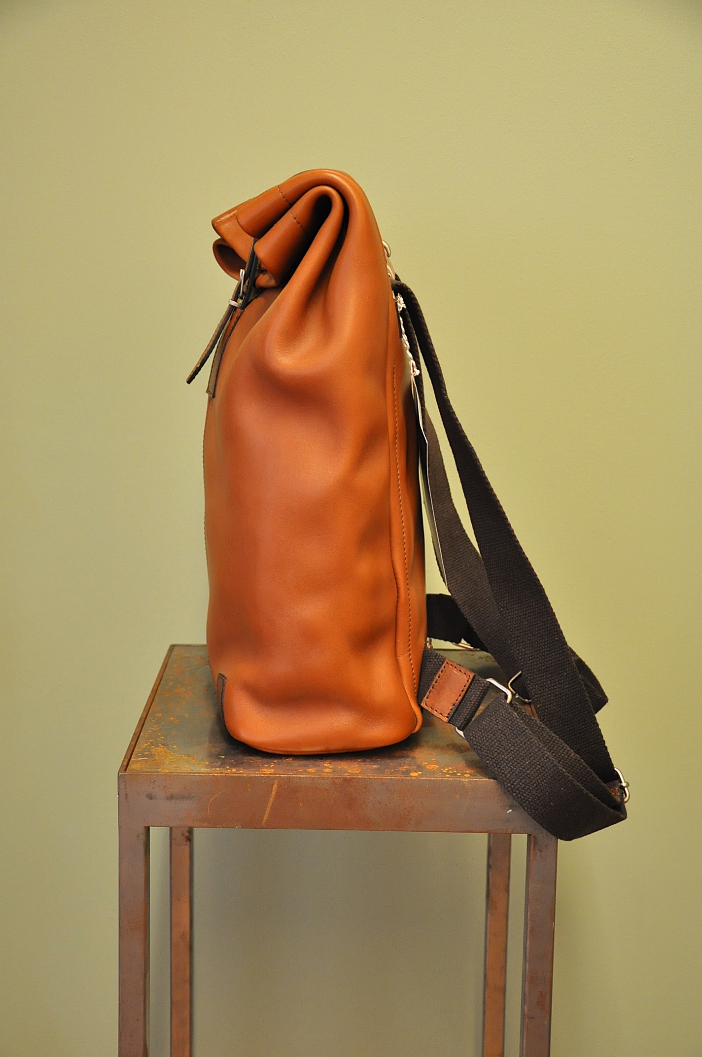 Der Rucksack aus hochwertigem Rindsleder besticht wegen seines schlichten Formats. Die Riementräger aus Leinen sind der gewollte Kontrast zum pflanzlich gegerbten Lederrucksack. Der Träger, als einziges von der Front sichtbares Element, lässt auf den ersten Blick nicht erahnen, was folgt.