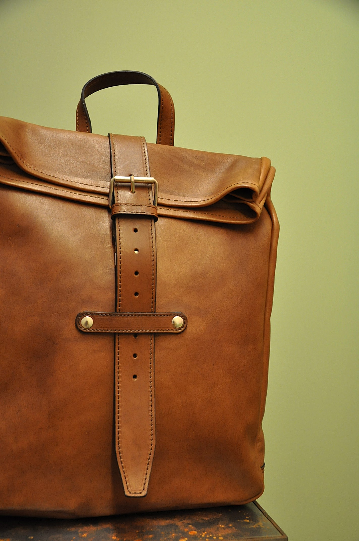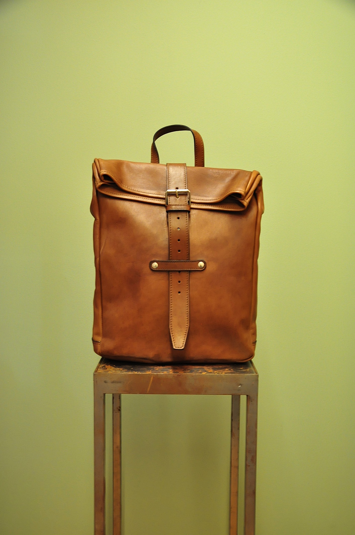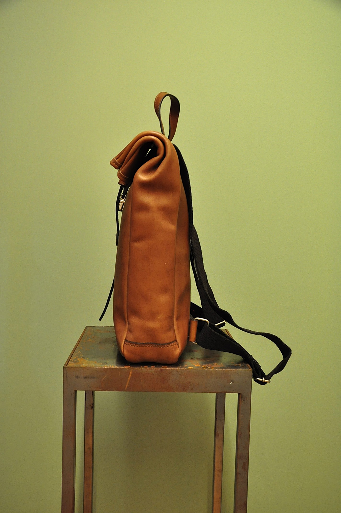 Der Rucksack aus hochwertigem Rindsleder besticht wegen seines schlichten Formats. Die Riementräger aus Leinen sind der gewollte Kontrast zum pflanzlich gegerbten Lederrucksack. Der Träger, als einziges von der Front sichtbares Element, lässt auf den ersten Blick nicht erahnen, was folgt.