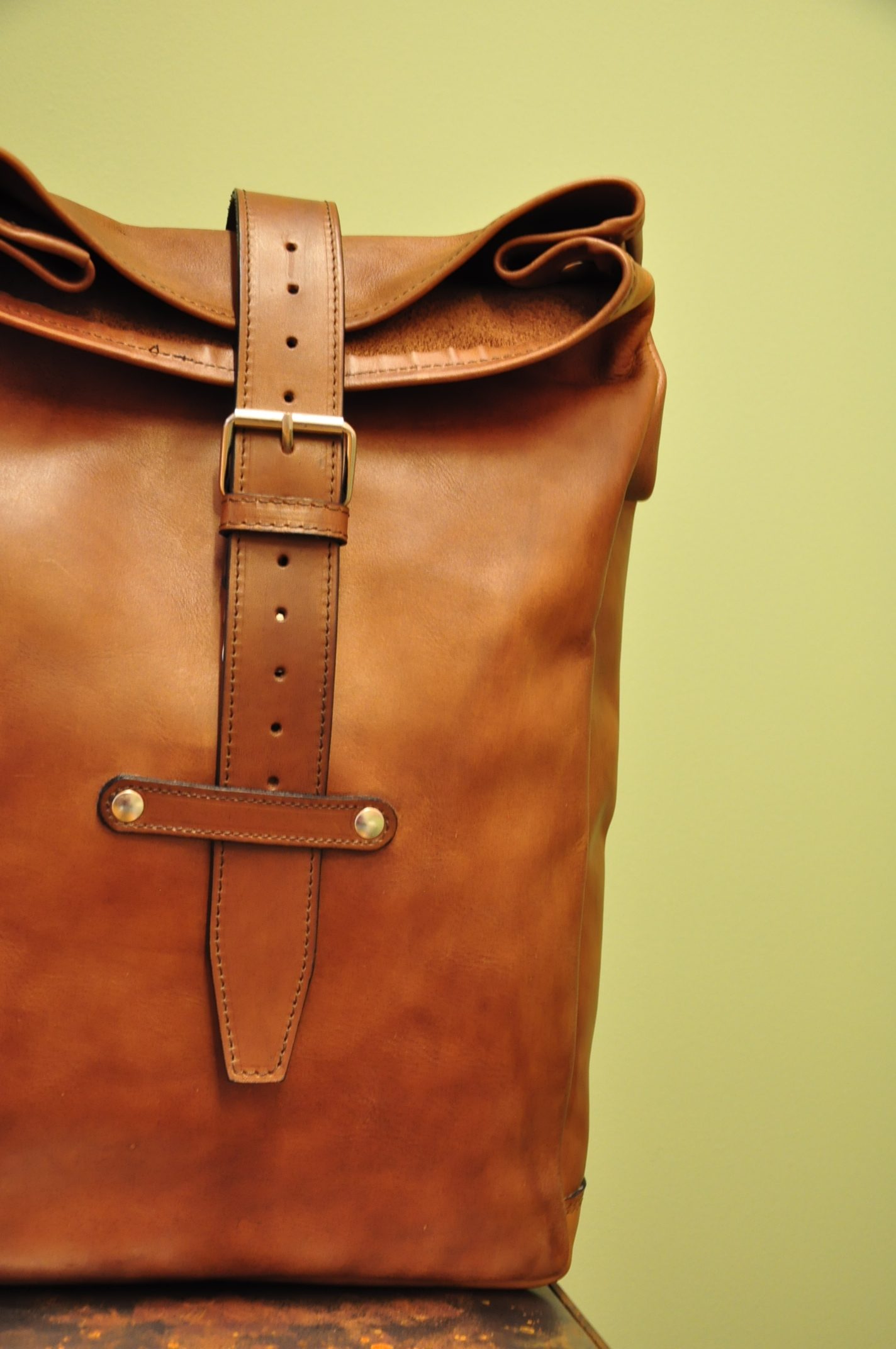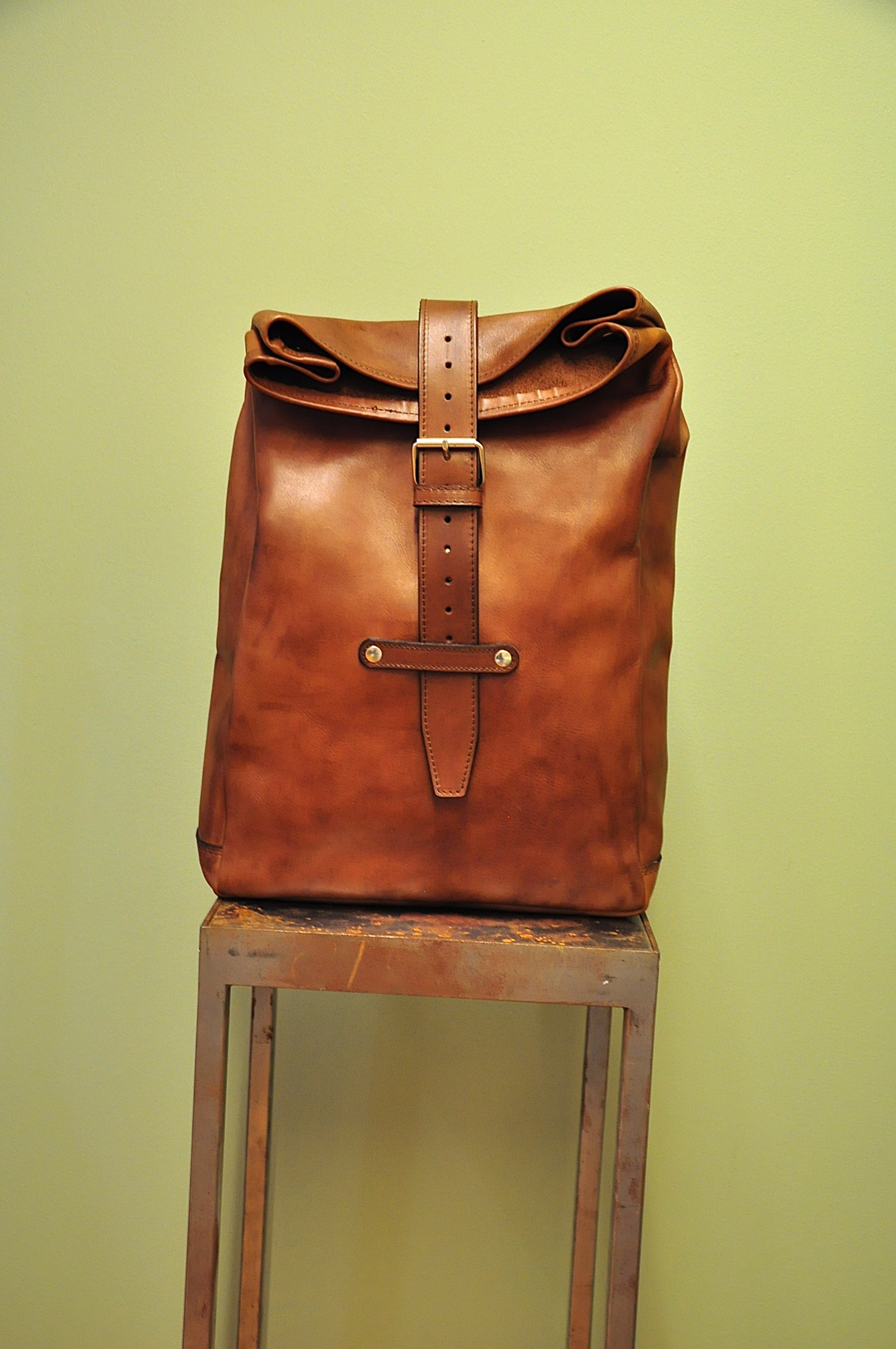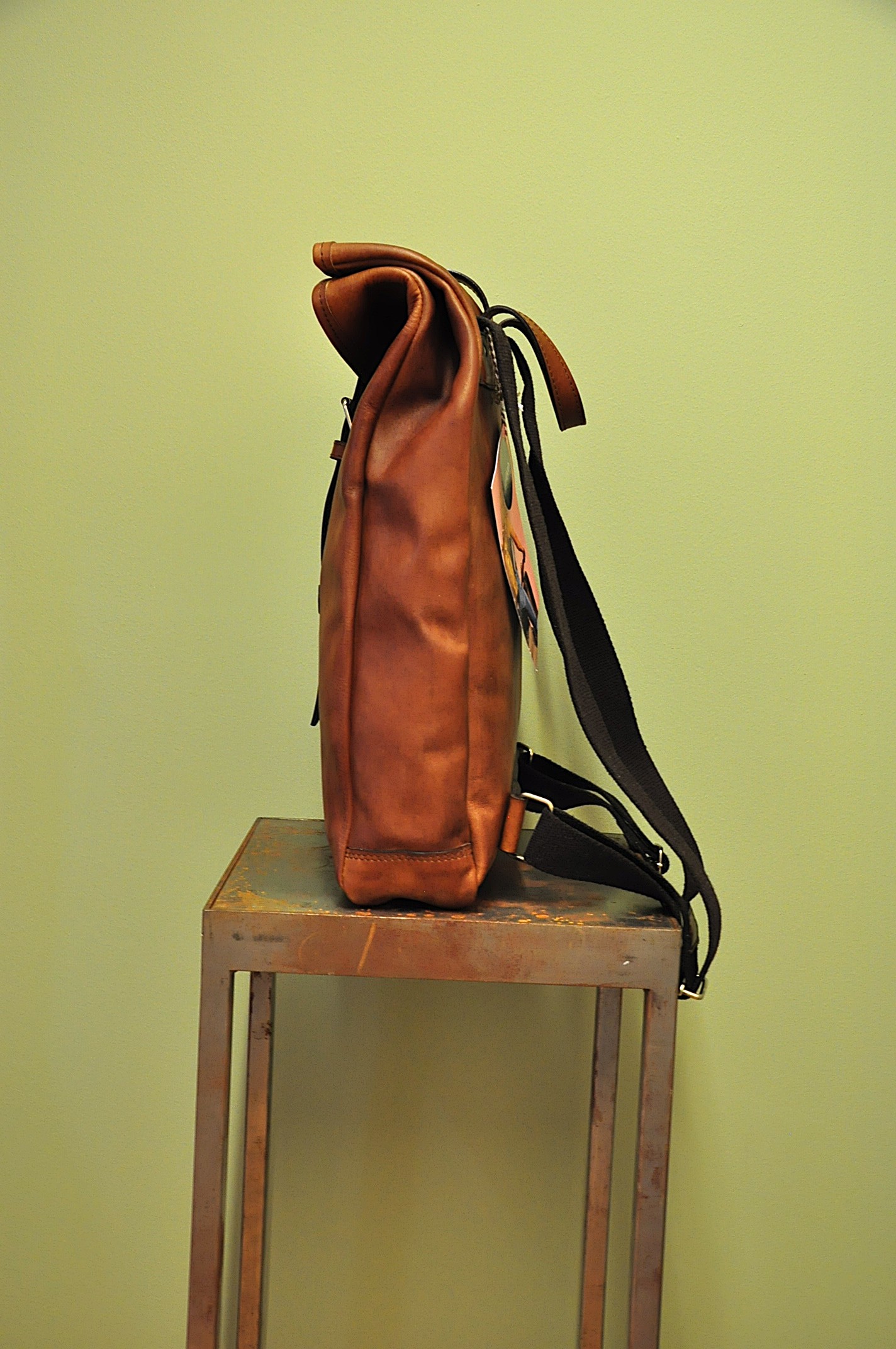 Der Rucksack aus hochwertigem Rindsleder besticht wegen seines schlichten Formats. Die Riementräger aus Leinen sind der gewollte Kontrast zum pflanzlich gegerbten Lederrucksack. Der Träger, als einziges von der Front sichtbares Element, lässt auf den ersten Blick nicht erahnen, was folgt.