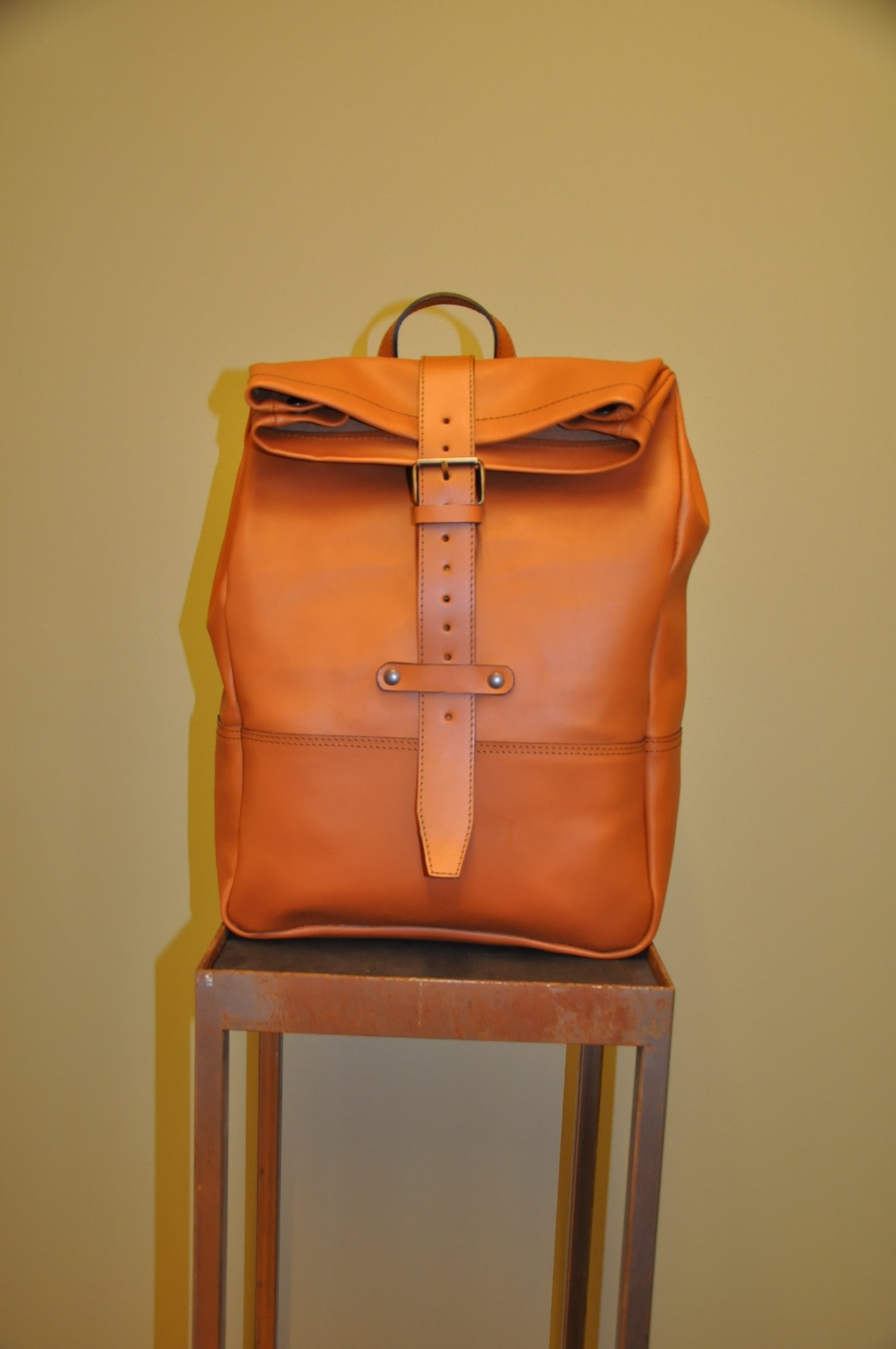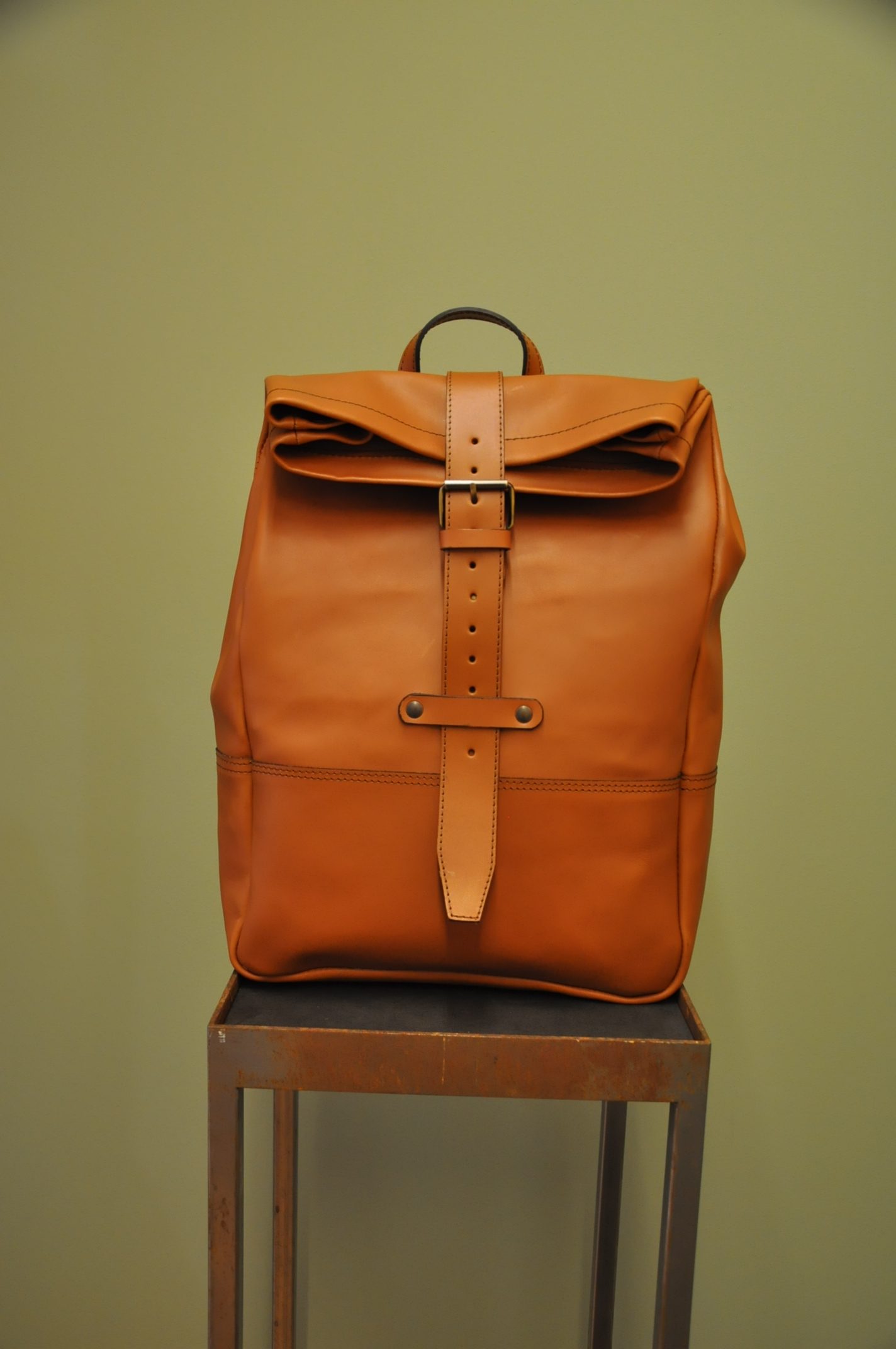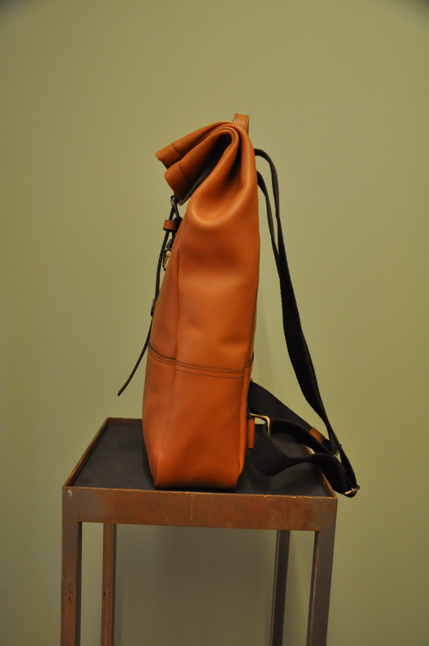 Der Rucksack aus hochwertigem Rindsleder besticht wegen seines schlichten Formats. Die Riementräger aus Leinen sind der gewollte Kontrast zum pflanzlich gegerbten Lederrucksack. Der Träger, als einziges von der Front sichtbares Element, lässt auf den ersten Blick nicht erahnen, was folgt.