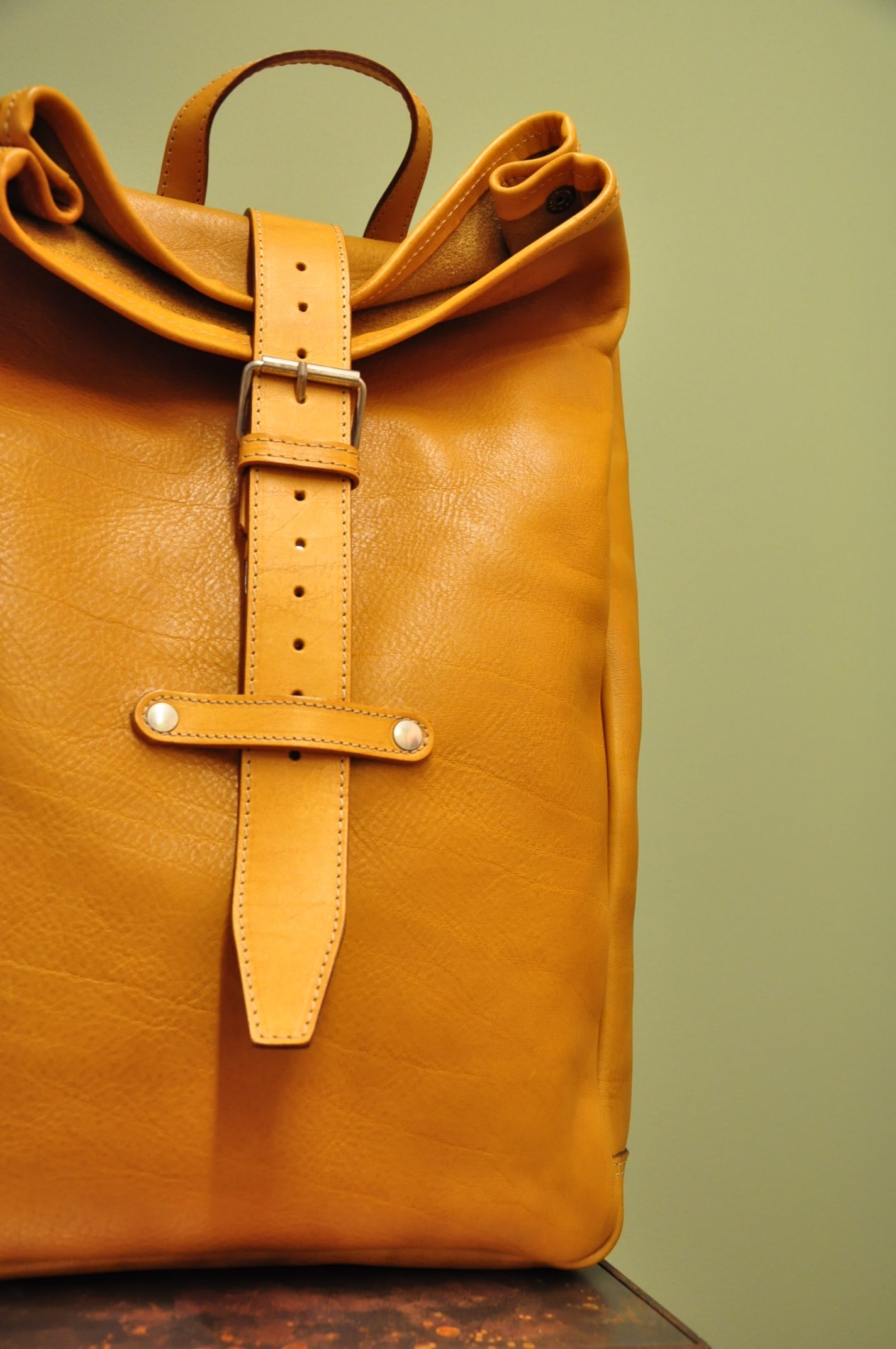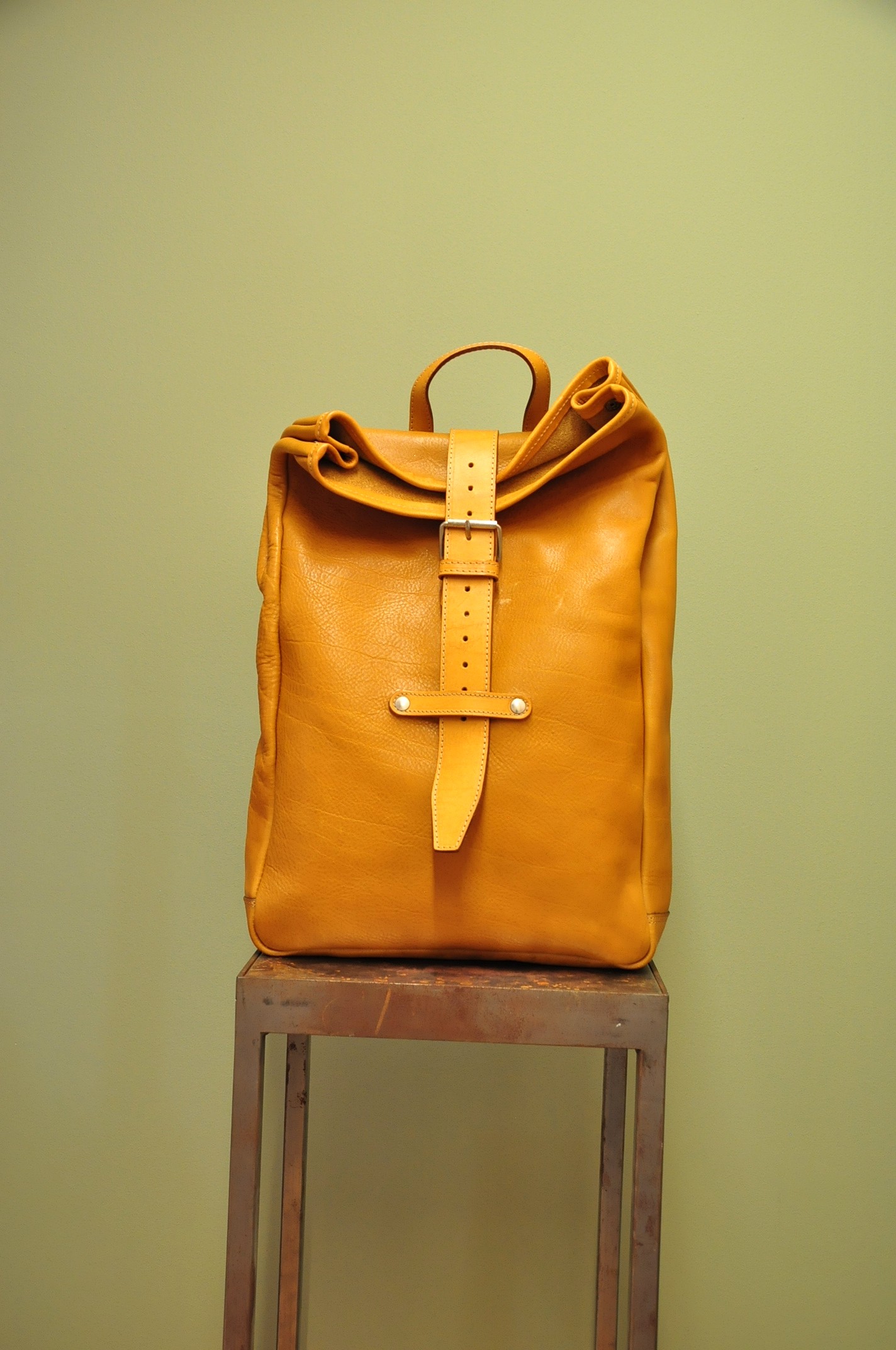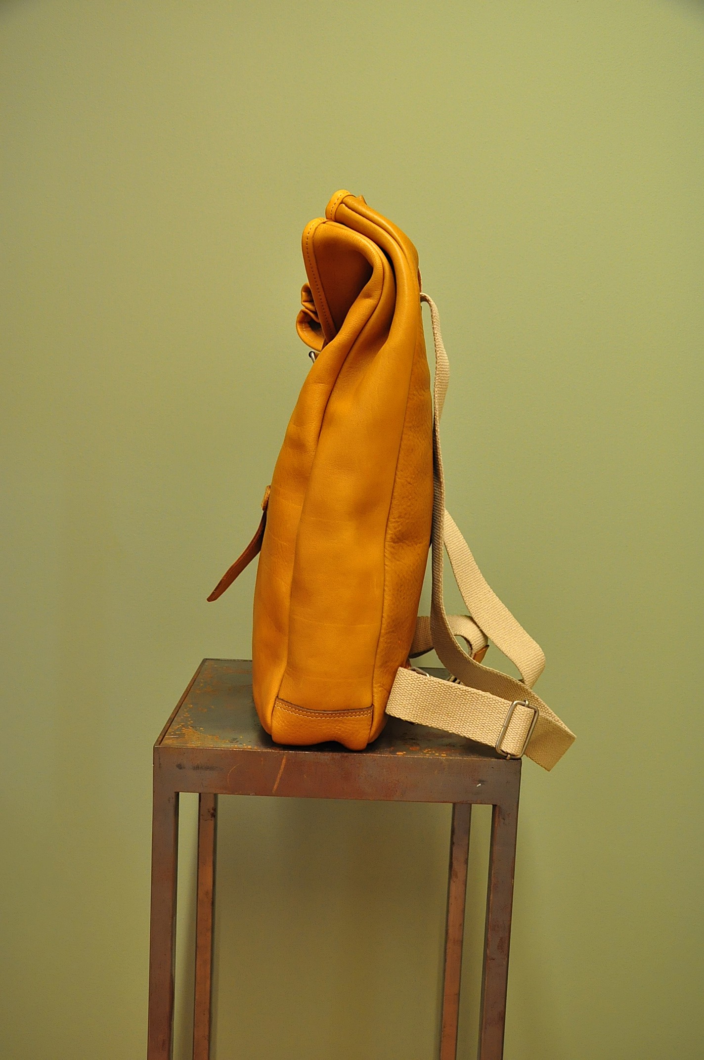 Der Rucksack aus hochwertigem Rindsleder besticht wegen seines schlichten Formats. Die Riementräger aus Leinen sind der gewollte Kontrast zum pflanzlich gegerbten Lederrucksack. Der Träger, als einziges von der Front sichtbares Element, lässt auf den ersten Blick nicht erahnen, was folgt.